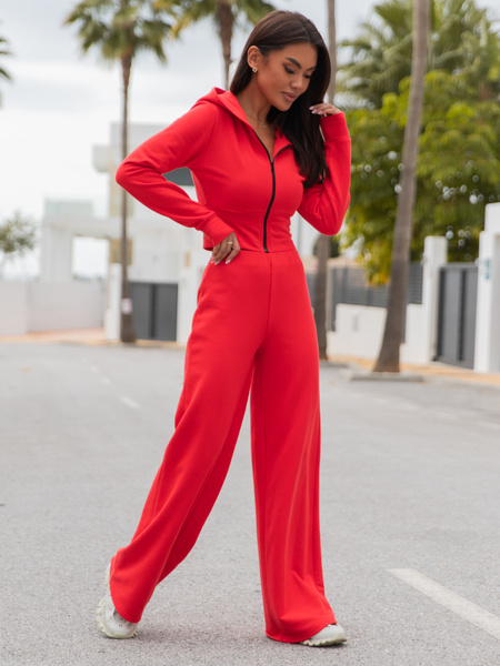 Dresowy komplet : dopasowana bluza na zamek z kapturem i spodnie z wysokim stanem dopasowane na biodrach z szerokimi nogawkami .Uszyte z dresowej bawełnianej dzianiny .