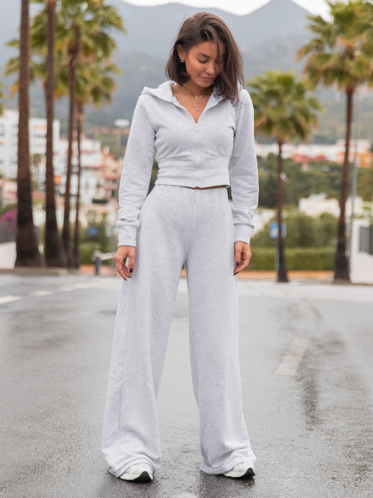 Dresowy komplet : dopasowana bluza na zamek z kapturem i spodnie z wysokim stanem dopasowane na biodrach z szerokimi nogawkami .Uszyte z dresowej bawełnianej dzianiny .