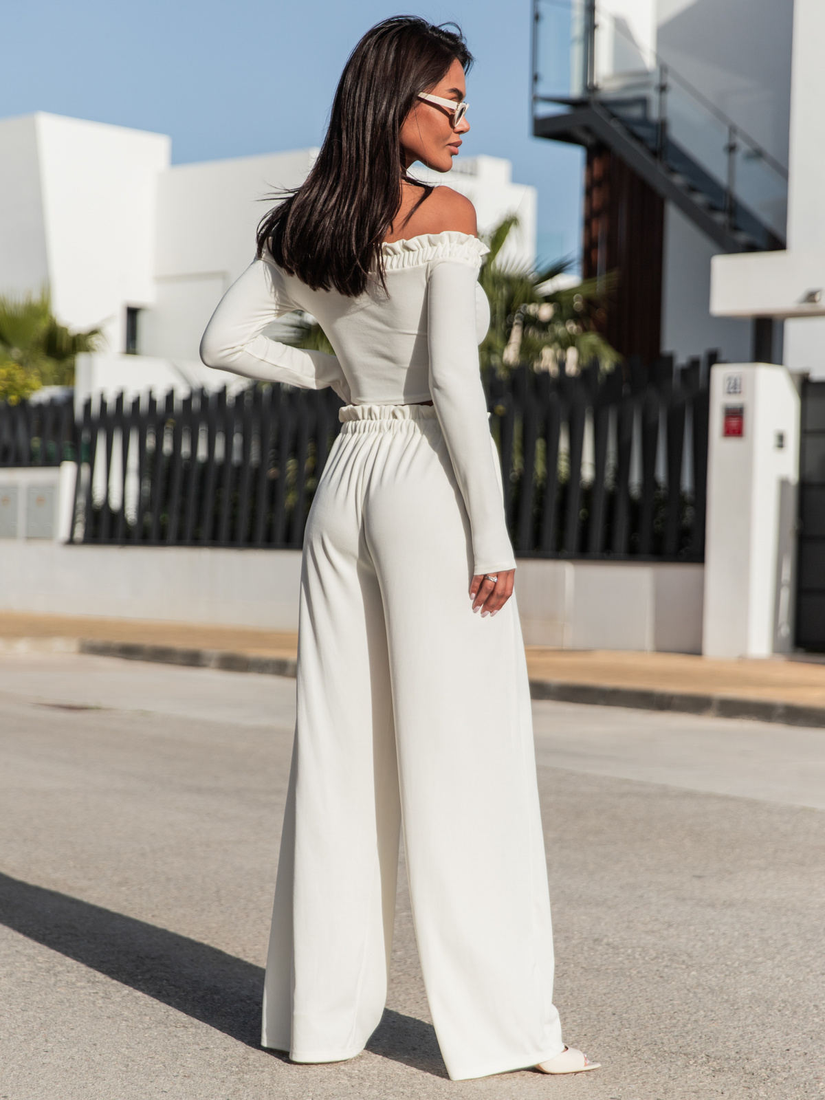 KOMPLET bluzka z długim rękawem opuszczana na ramiona i szerokie spodnie ecru X100 k01
