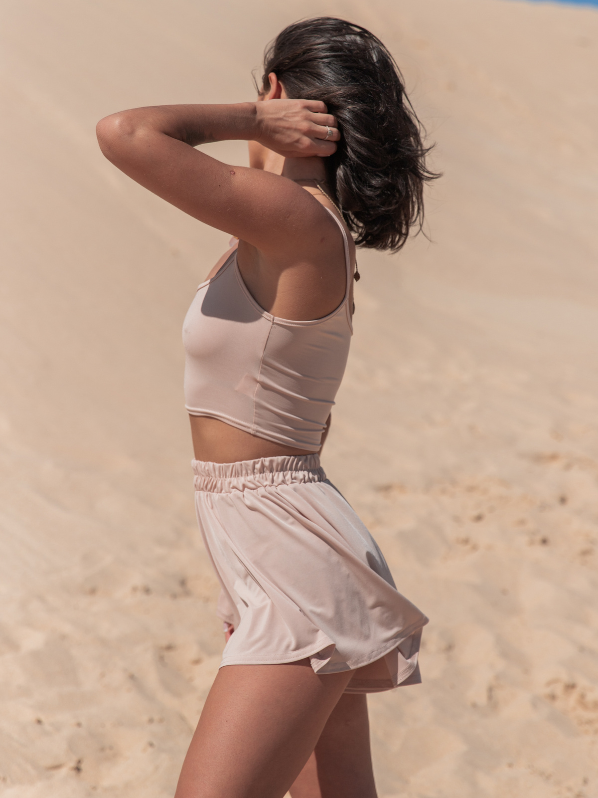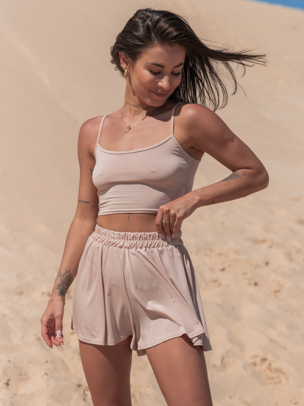 Komplet: top na cienkich ramiączkach, dopasowany i spodenki krój luźny z wysokim stanem. Uszyty z delikatnej dzianiny poliestrowej