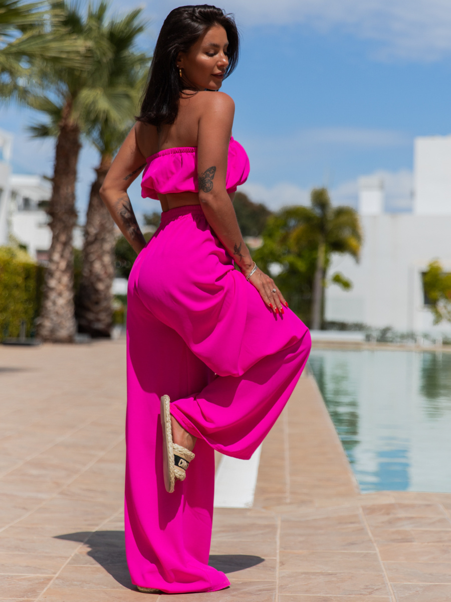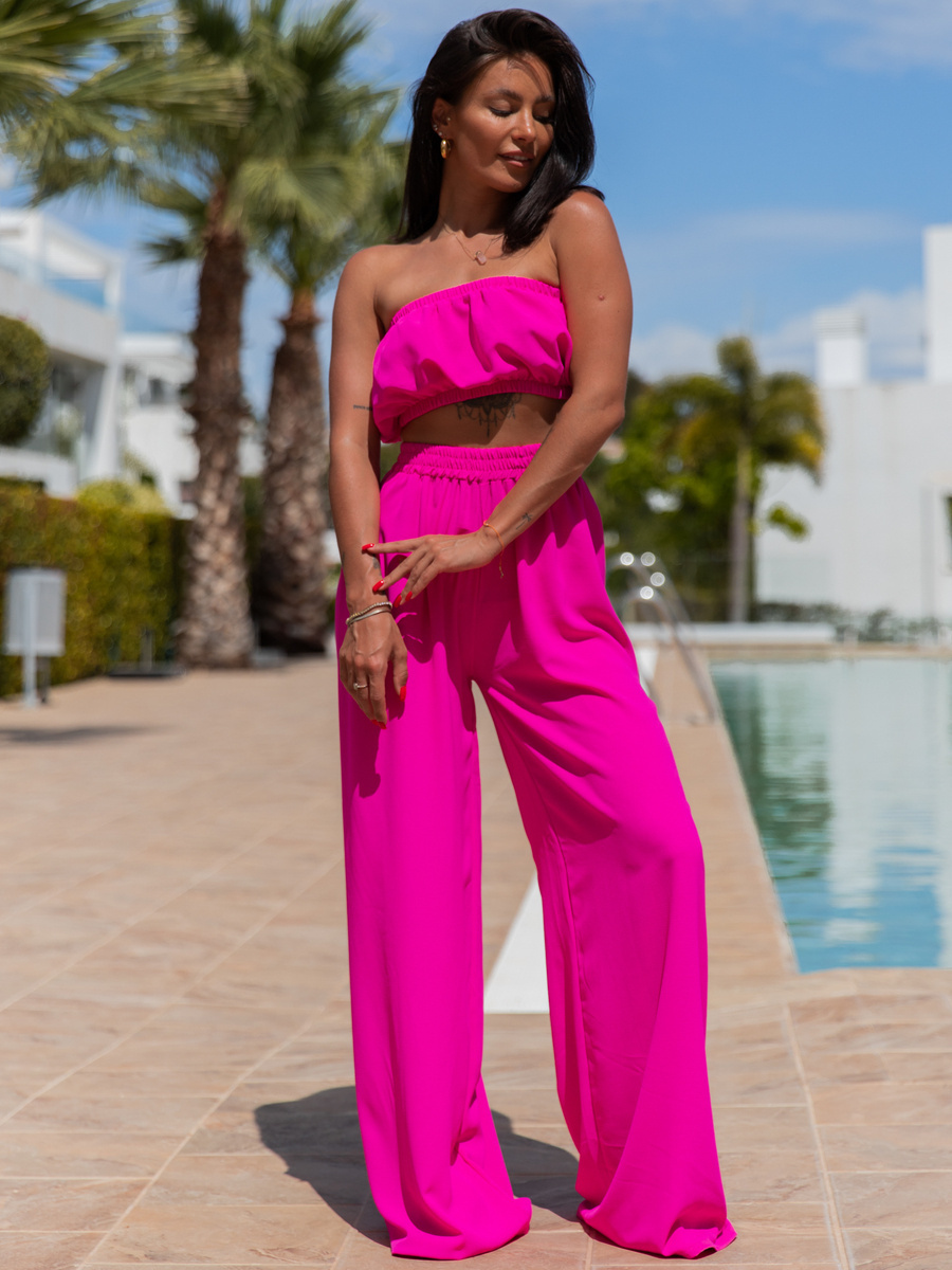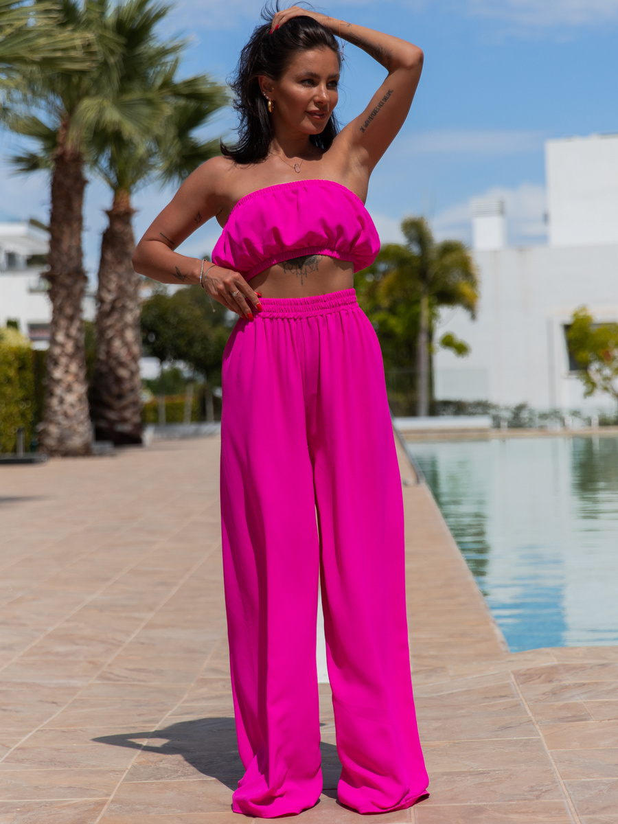 Komplet: krótki top w formie opaski i szerokie spodnie z wysokim stanem. Uszyty z przewiewnego materiału.