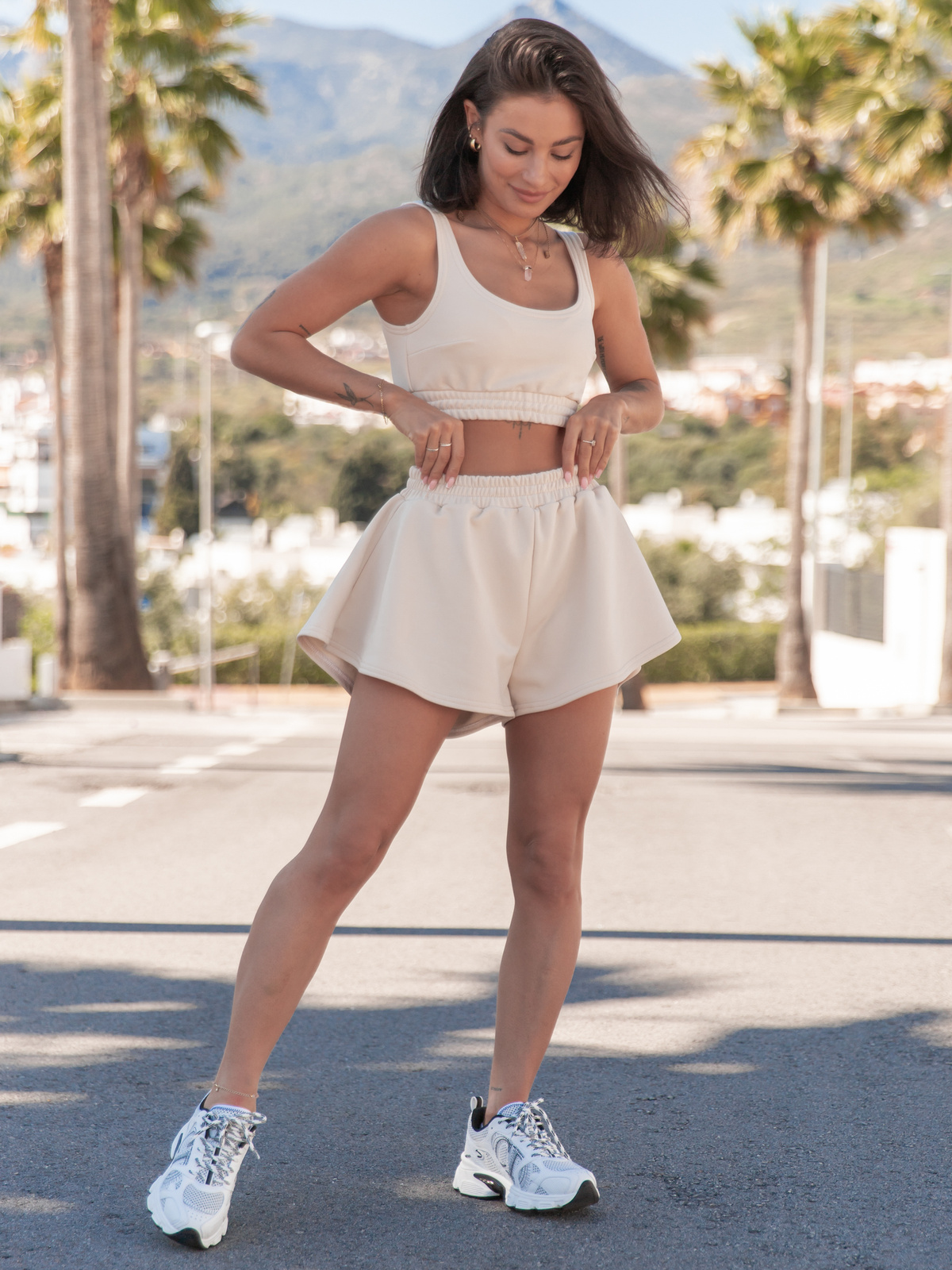 Dresowy bawełniany KOMPLET krótki top na ramkach i krótkie spodenki waniliowy X120 k01