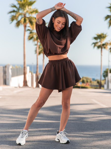 Dresowy bawełniany KOMPLET bluza z krótszym rękawem bluzowana i spodenki asymetryczne czekoladowy X121 k01