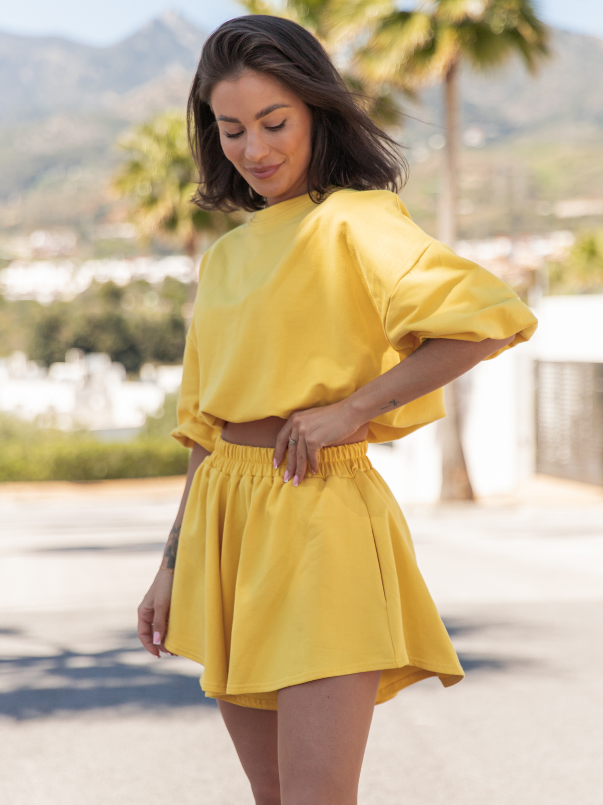 Dresowy bawełniany KOMPLET bluza z krótszym rękawem bluzowana i spodenki asymetryczne żółty X121 k01