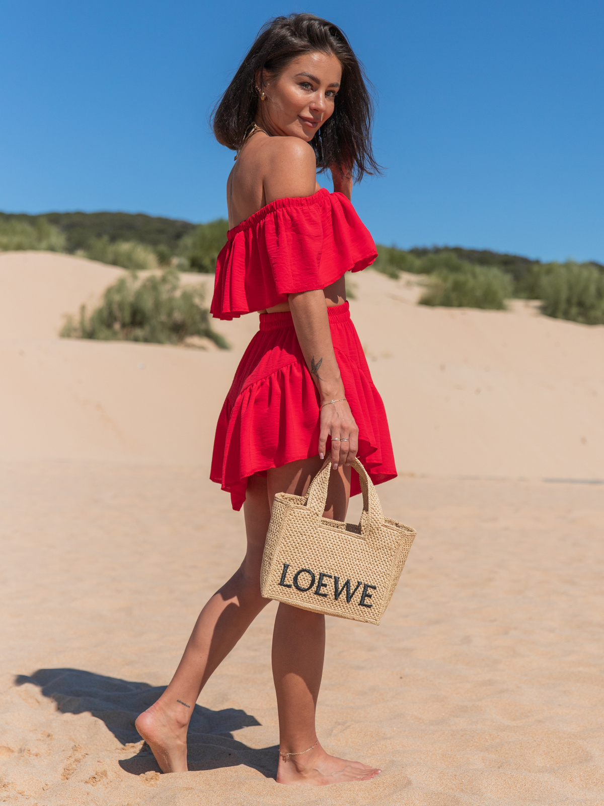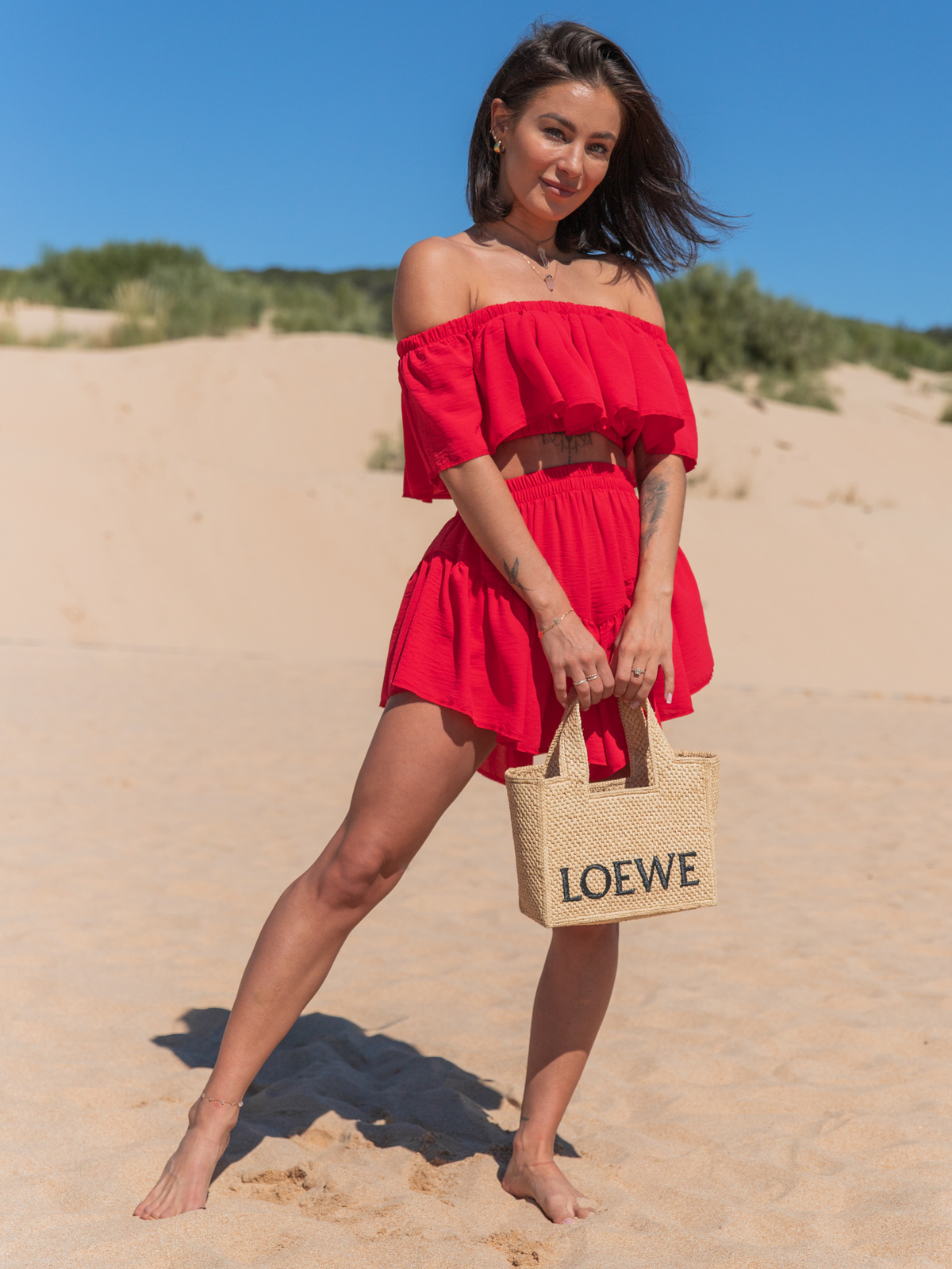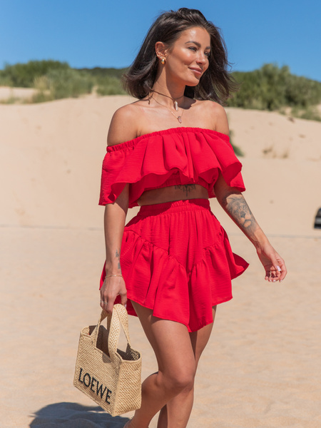 Komplet : luźna bluzka opuszczana na ramiona w stylu hiszpańskim , z falbanką na ramionach i krótkie spódnicospodenki . Uszyty ze zwiewnej tkaniny strukturalnej.