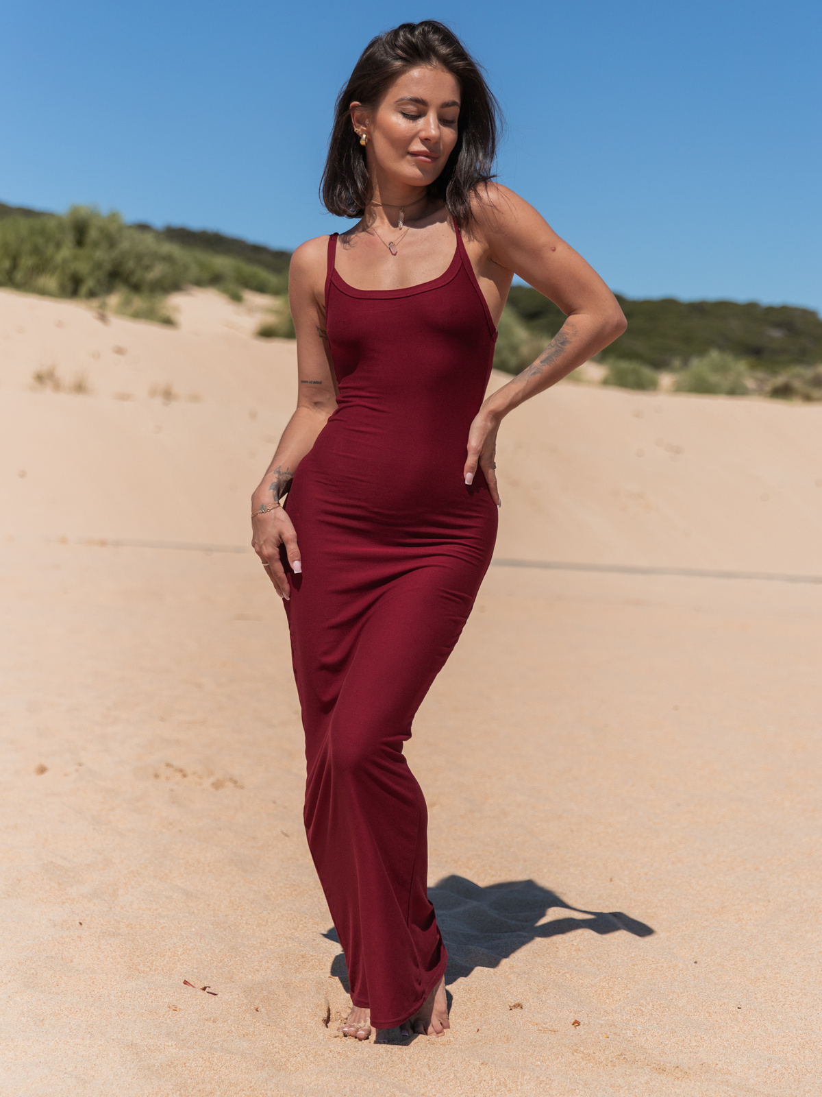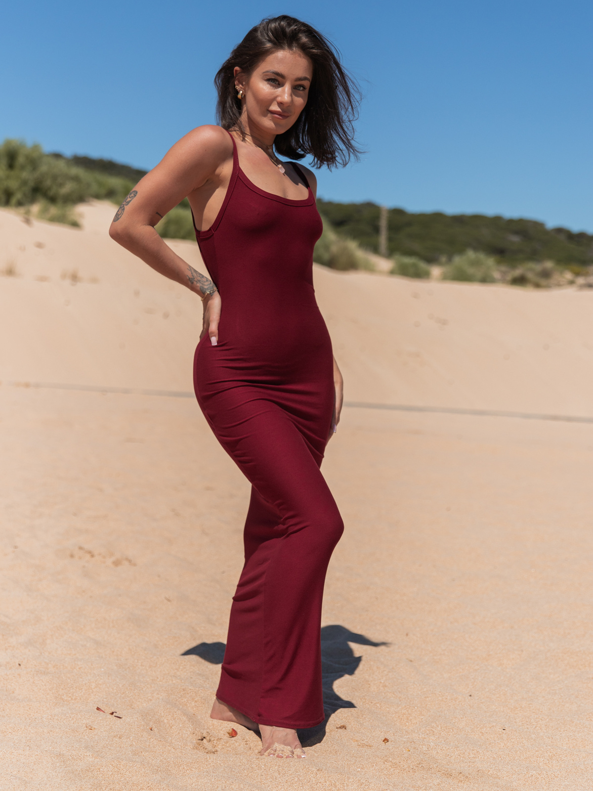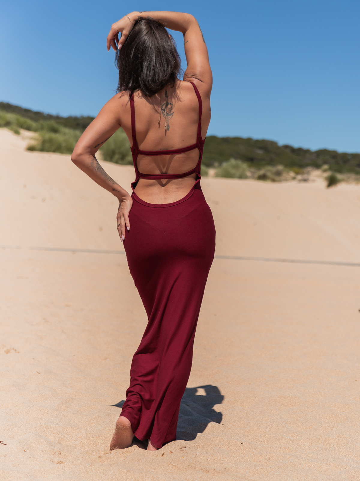 Wiskozowa SUKIENKA maxi na ramiączkach z gołymi plecami bordowa X130 k01