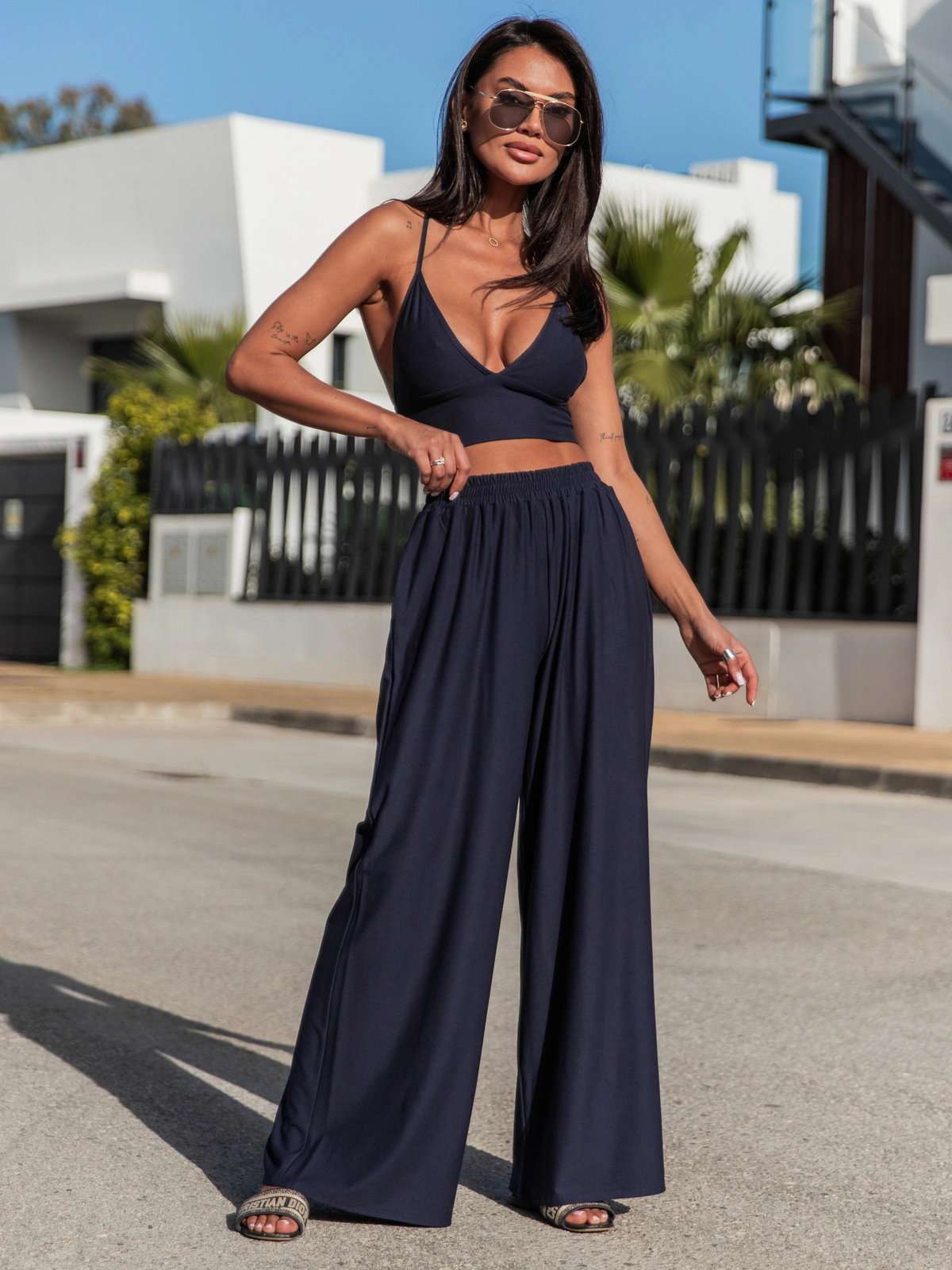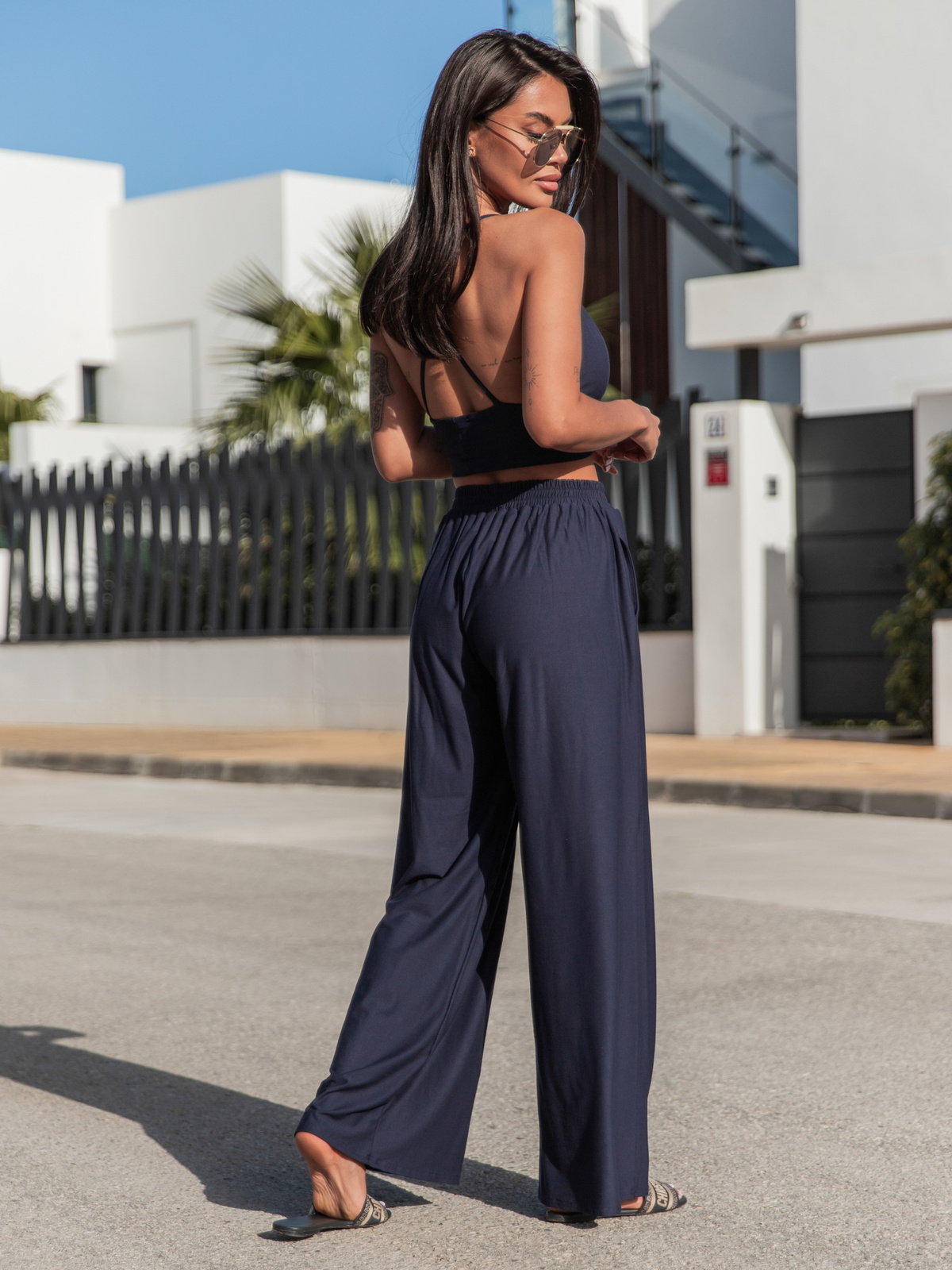 Wiscozowy KOMPLET top stanik na ramiączkach i szerokie spodnie z gumką w pasie navy blue X131 k01