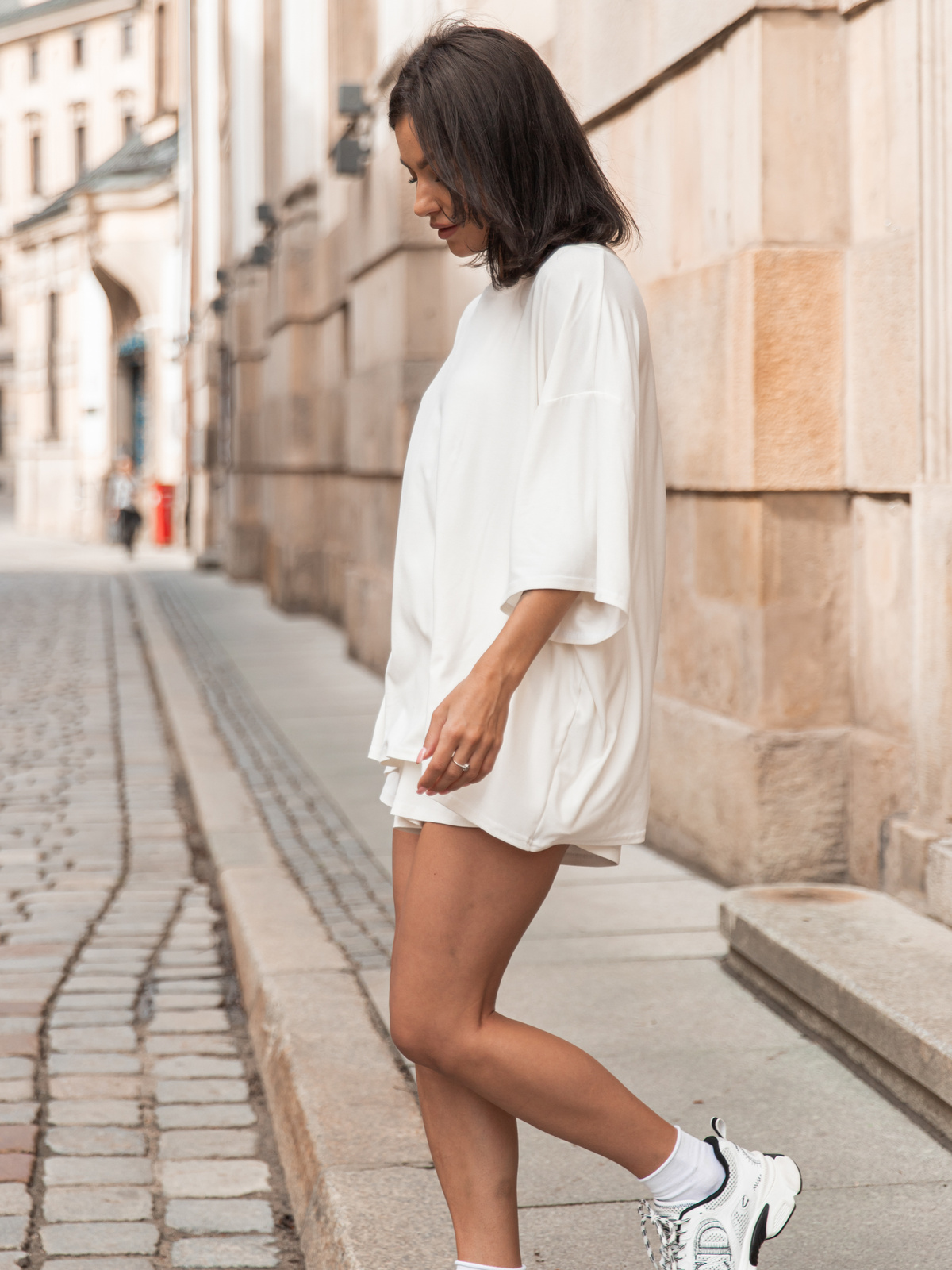 • Komplet : luźny oversizowy t-shirt z krótkim rękawem i krótkie spodenki z gumką w pasie z wysokim stanem. Uszyty z miękkiej i elastycznej wiscozy od polskiego producenta .