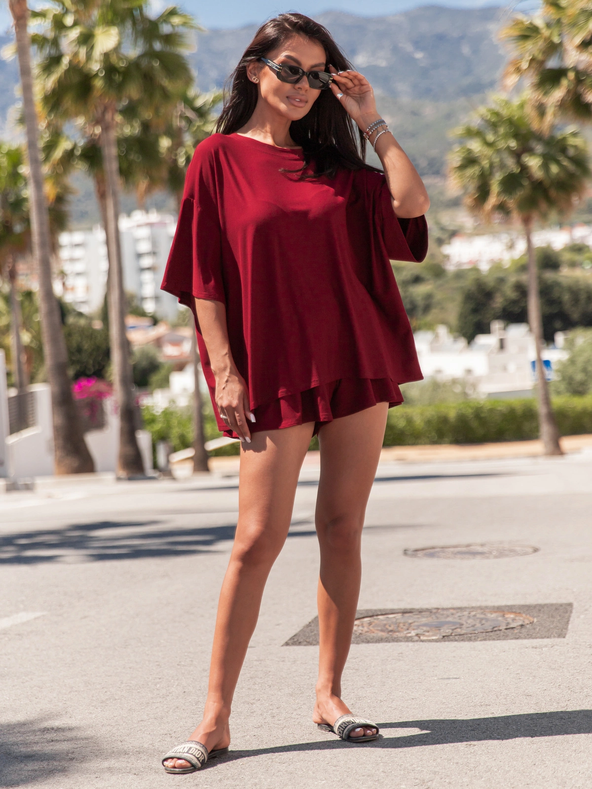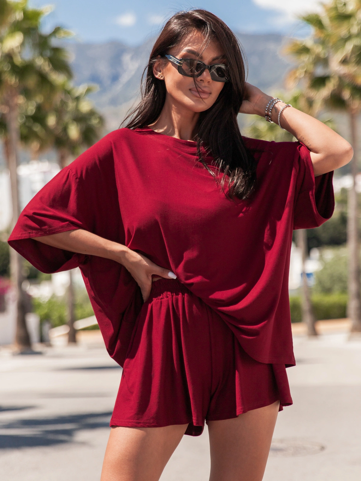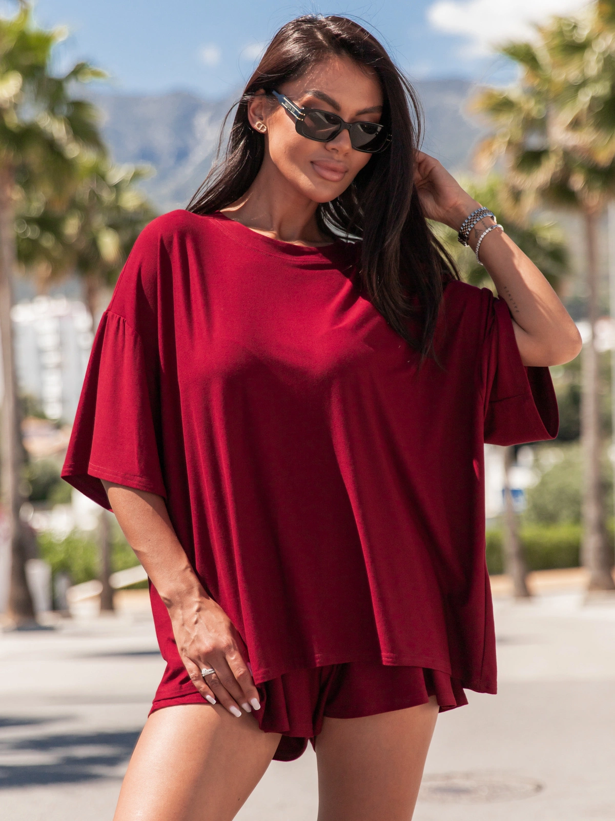 Wiscozowy KOMPLET luźny oversizowy t-shirt i krótkie spodenki z gumką w pasie bordowy X172 k01
