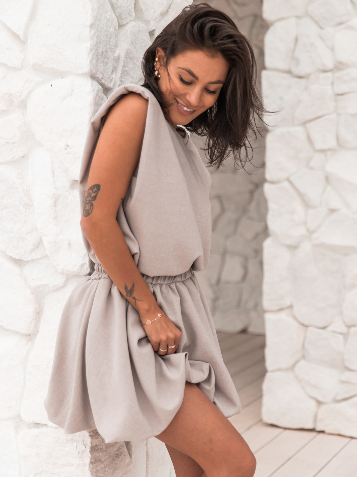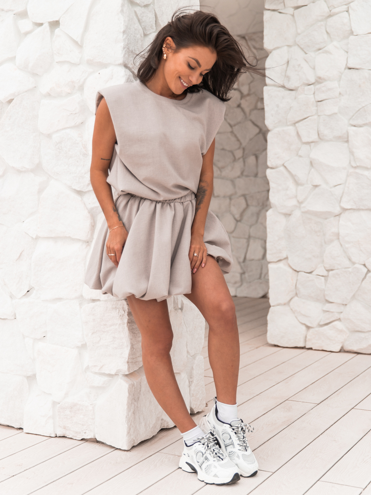 Letni komplet: luźny t-shirt bez rękawów z poduszkami na ramionach i spódnica mini krój bombki . Uszyty z tkaniny ala len , nie gniecie się , jest przewiewny .