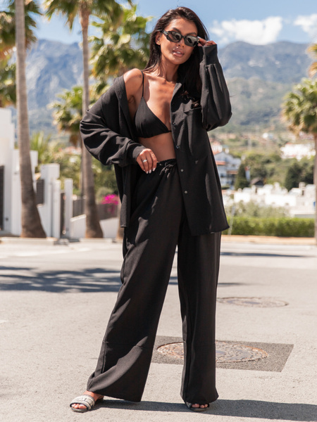 Komfortowy KOMPLET oversizowa koszula z długim rękawem i długie luźne spodnie z tkaniny ala len czarny X174 k01