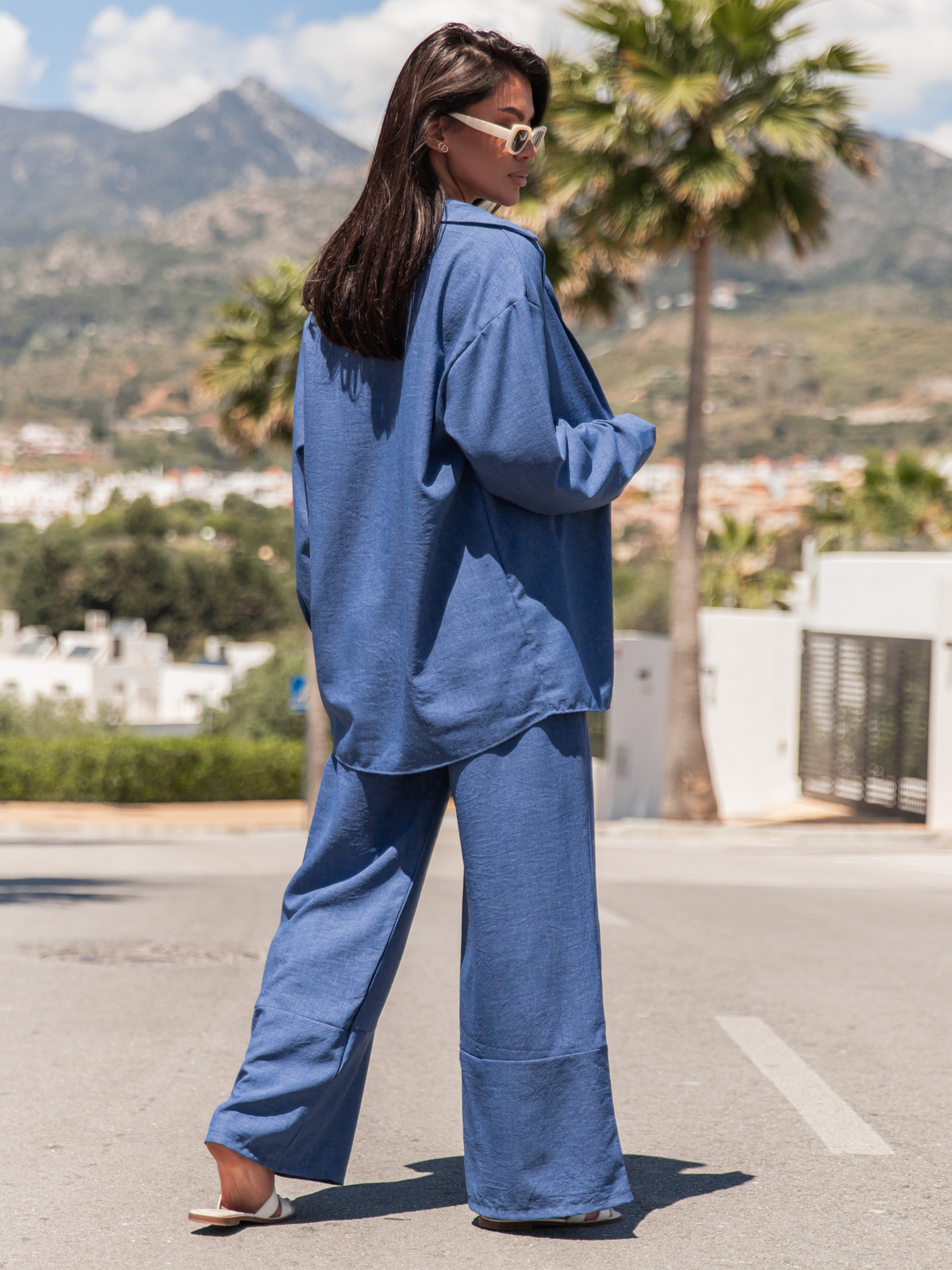 Komfortowy KOMPLET oversizowa koszula z długim rękawem i długie luźne spodnie z tkaniny ala len ciemny jeansowy X174 k01