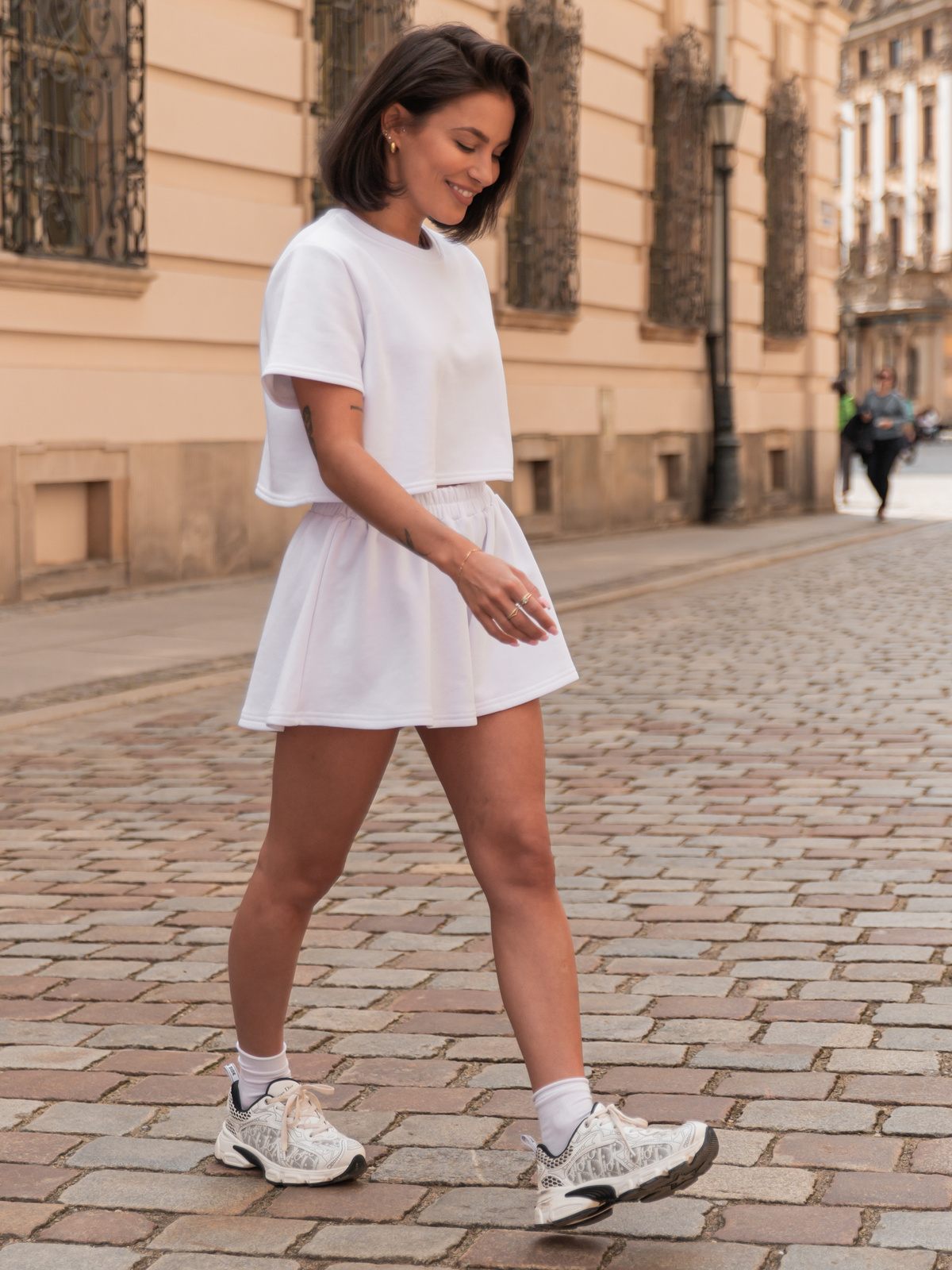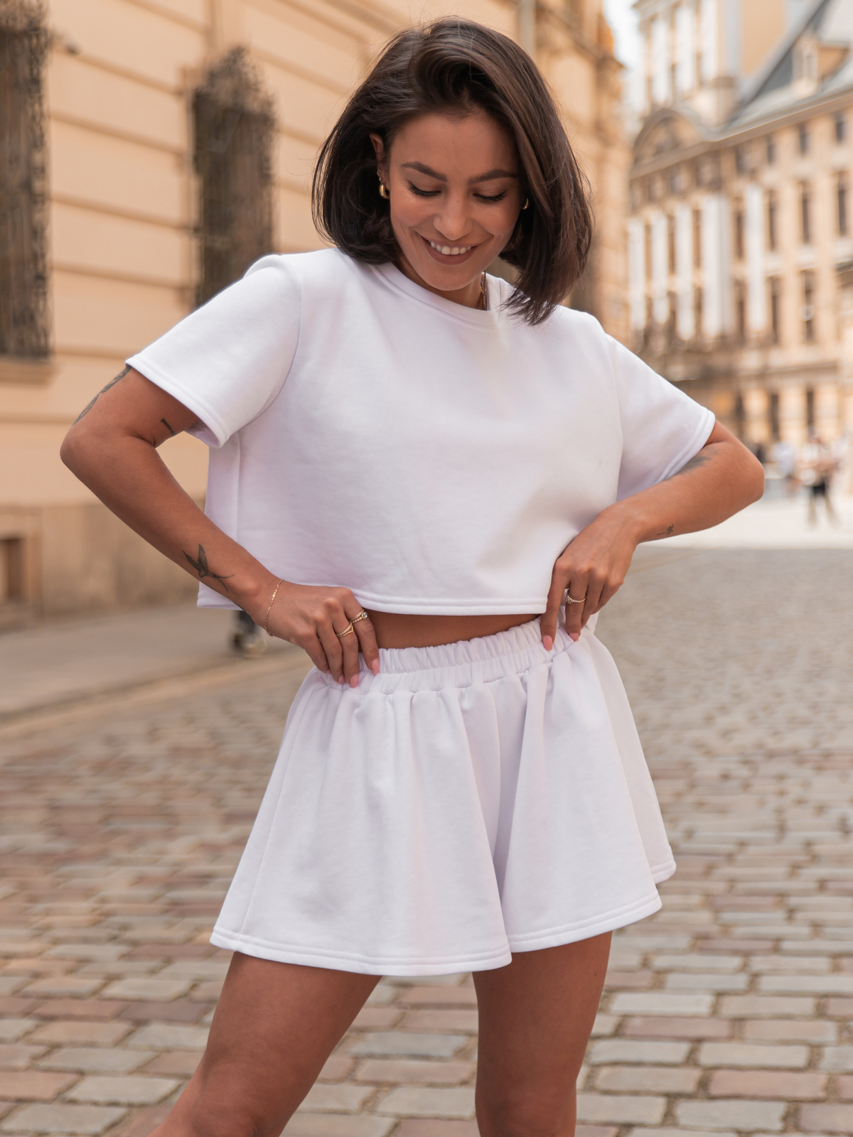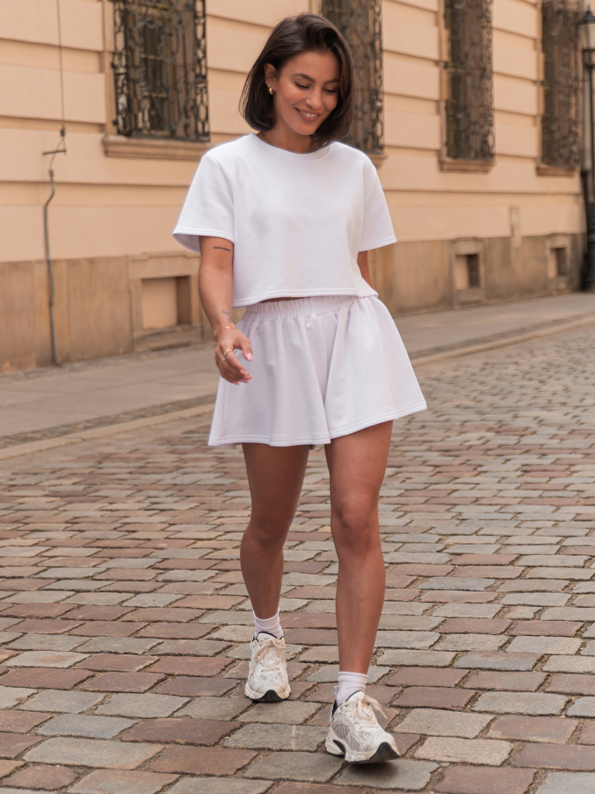 Luźny krój bluzy zapewnia pełną swobodę ruchów i wygodę, a krótkie spodenki z elastyczną gumką w pasie idealnie dopasowują się do sylwetki, nie krępując ruchów. Całość utrzymana jest w minimalistycznym stylu, dzięki czemu łatwo zestawić ją z innymi elementami garderoby lub dodatkami.