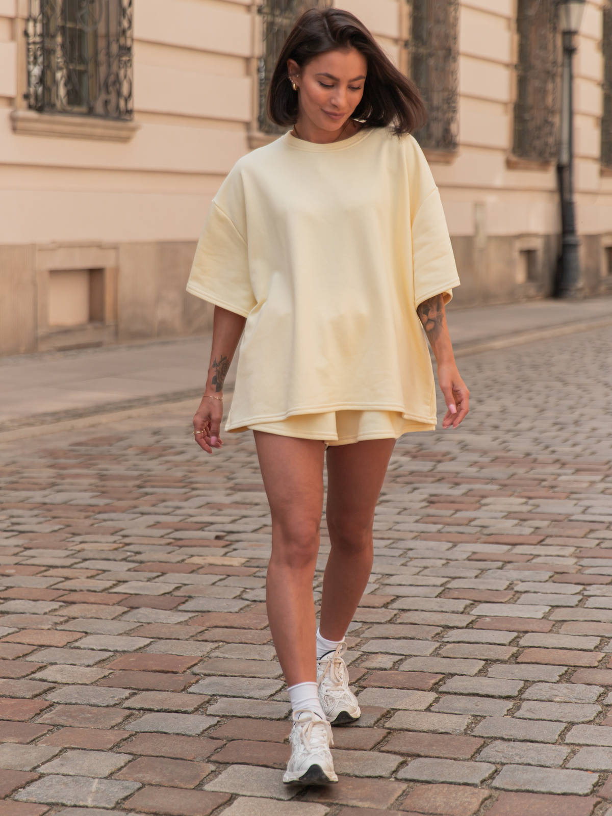 Opinie o Dresowy bawełniany KOMPLET długi oversizowy t-shirt i krótkie spodenki butter yellow jasny żółty X134 k01