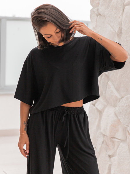 ZESTAW z wiskozy: luźny szeroki T-SHIRT z krótkim rękawem X201 + szerokie SPODNIE ze średnim stanem z gumką w pasie X202