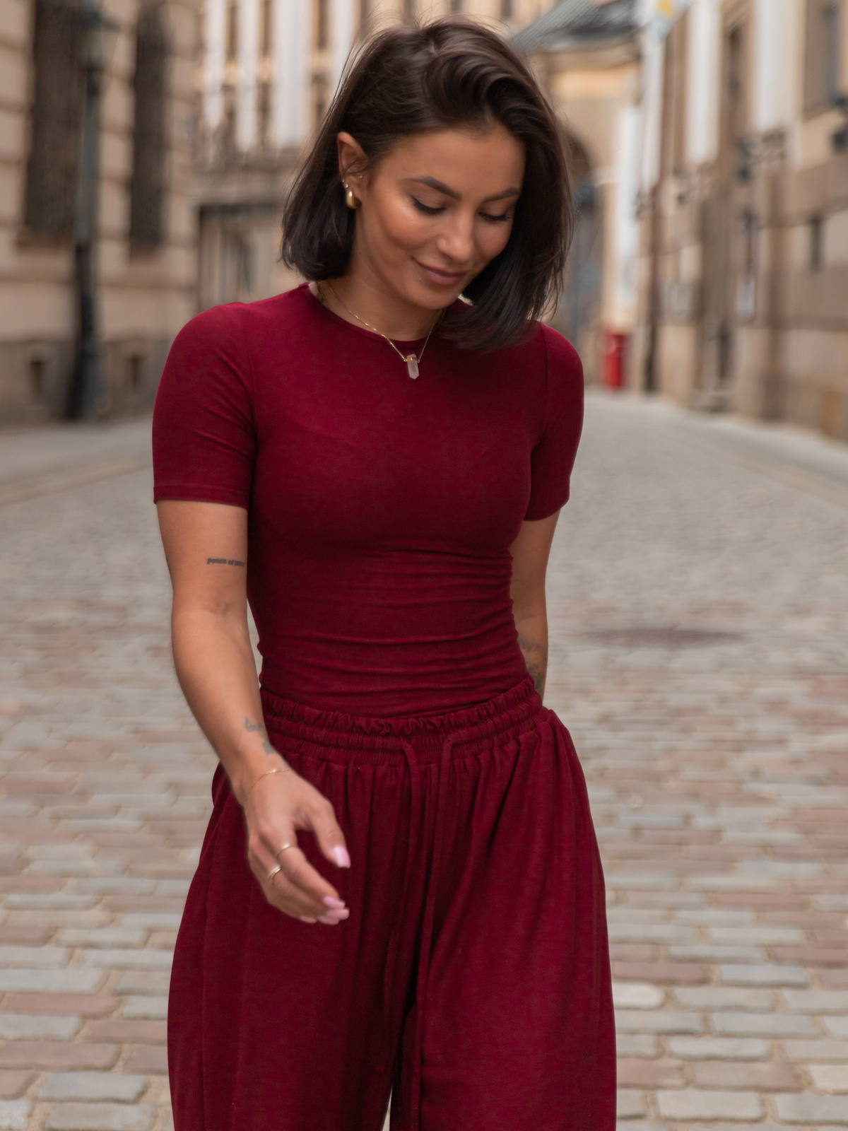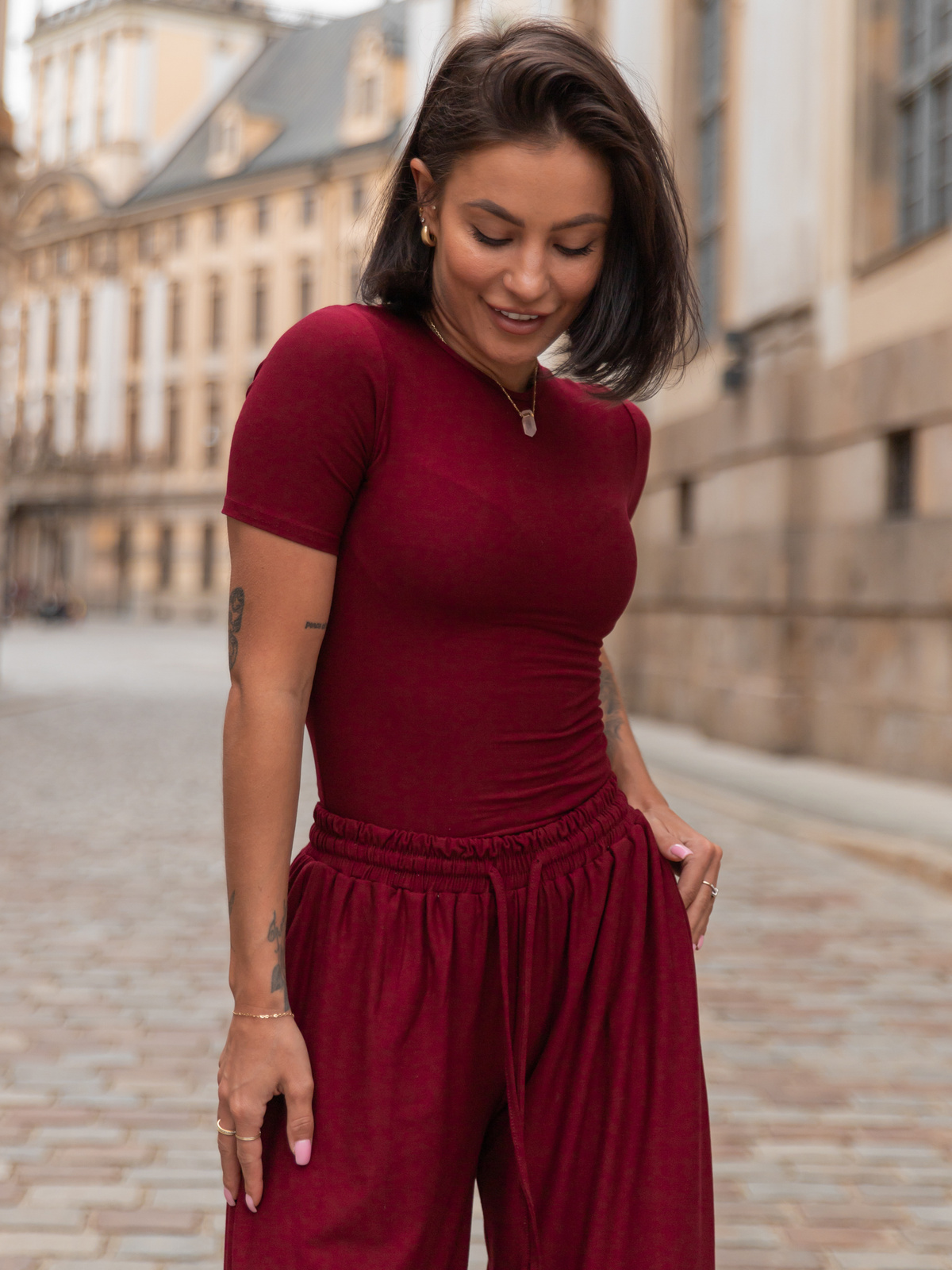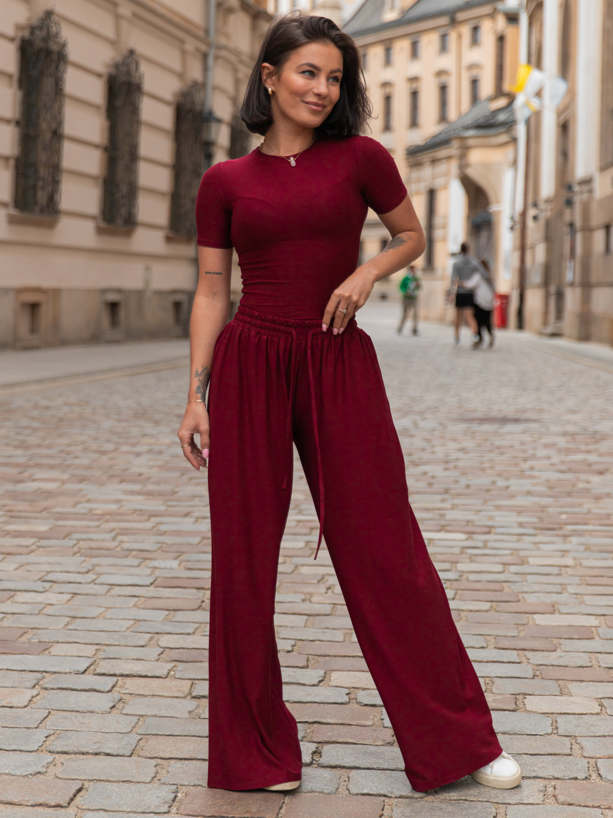Wiskoza to tkanina pochodzenia naturalnego – lekka, przewiewna i bardzo przyjemna dla skóry. Doskonale sprawdza się w cieplejsze dni, pozwala skórze oddychać i zapewnia wysoki komfort noszenia. Dodatek elastanu sprawia, że materiał jest elastyczny i lepiej dopasowuje się do sylwetki.