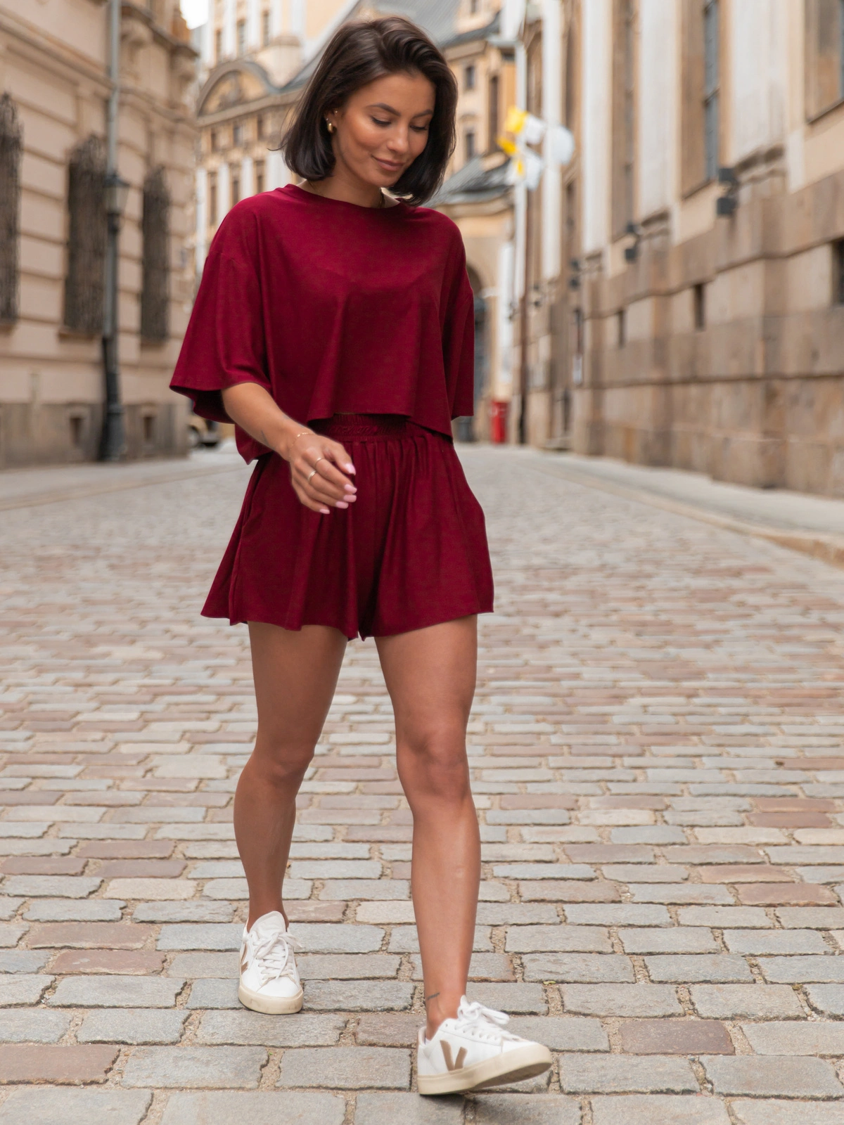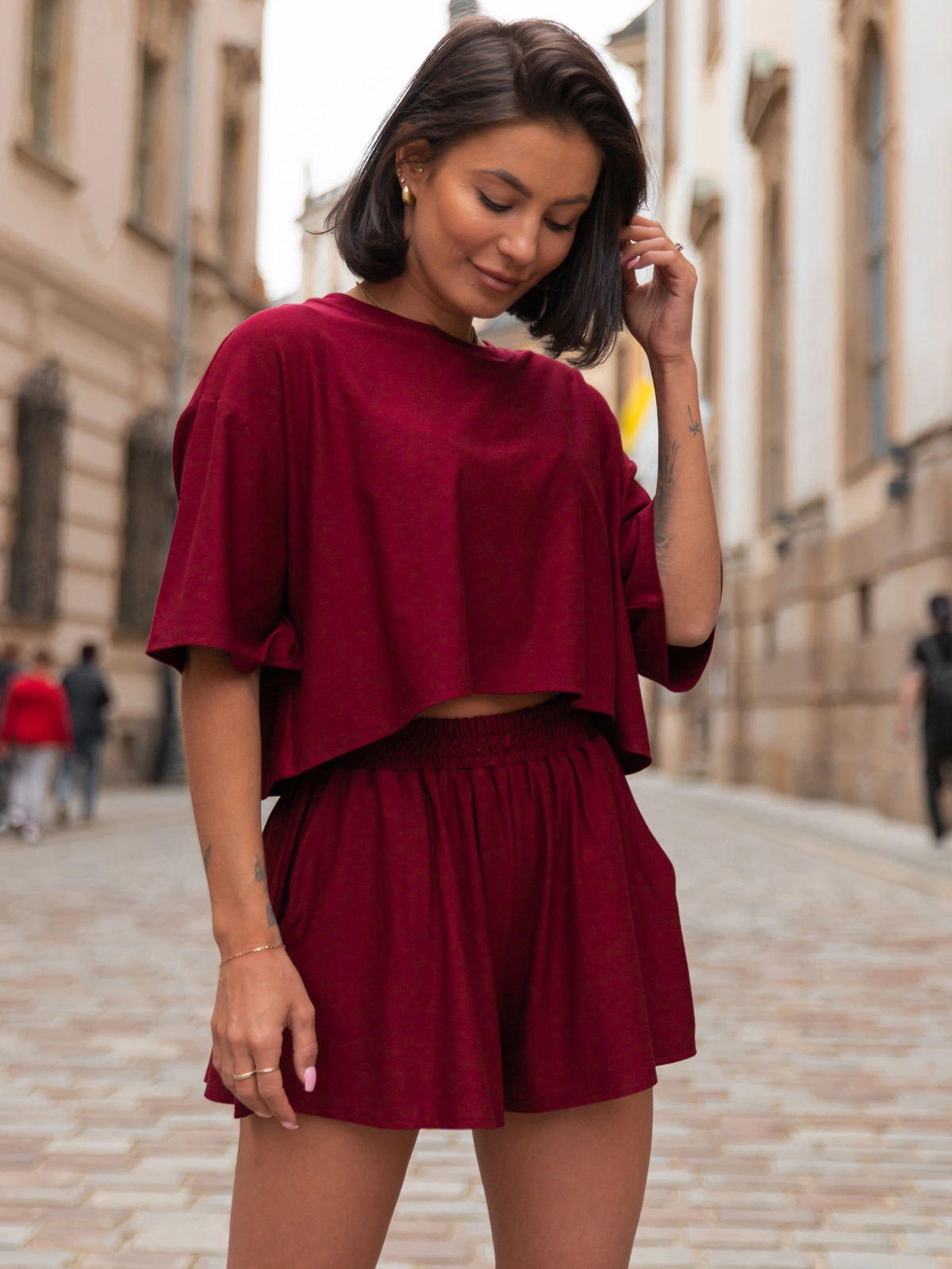 Świetnie komponują się zarówno z dopasowaną bluzką, jak i luźnym t-shirtem – możesz nosić je jako komplet lub łączyć z innymi elementami garderoby.