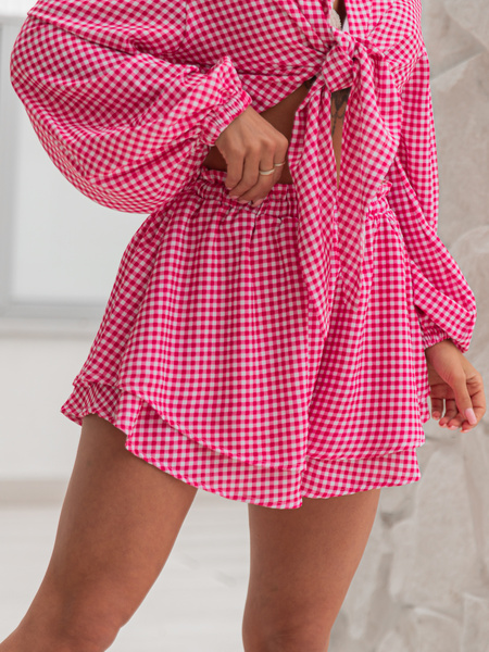 Zwiewne krótkie spodenki z gumką w pasie , uszyte z dwóch warstw materiału . Uszyte z przewiewnego materiału , bardzo przyjemnego dla ciała . Na innej aukcji można dokupić do kompletu koszulę z tego samego materiału .