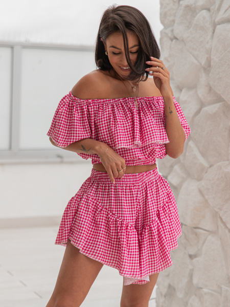 KOMPLET bluzka hiszpanka z odkrytymi ramionami i asymetryczne spódnico spodenki ze zwiewnej tkaniny w kratkę czerwony X209 k01