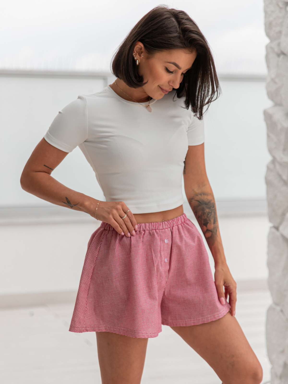 • Zwiewne krótkie spodenki z gumką w pasie . Uszyte z bawełnianego materiału w drobną kratkę , bardzo przyjemnego dla ciała .