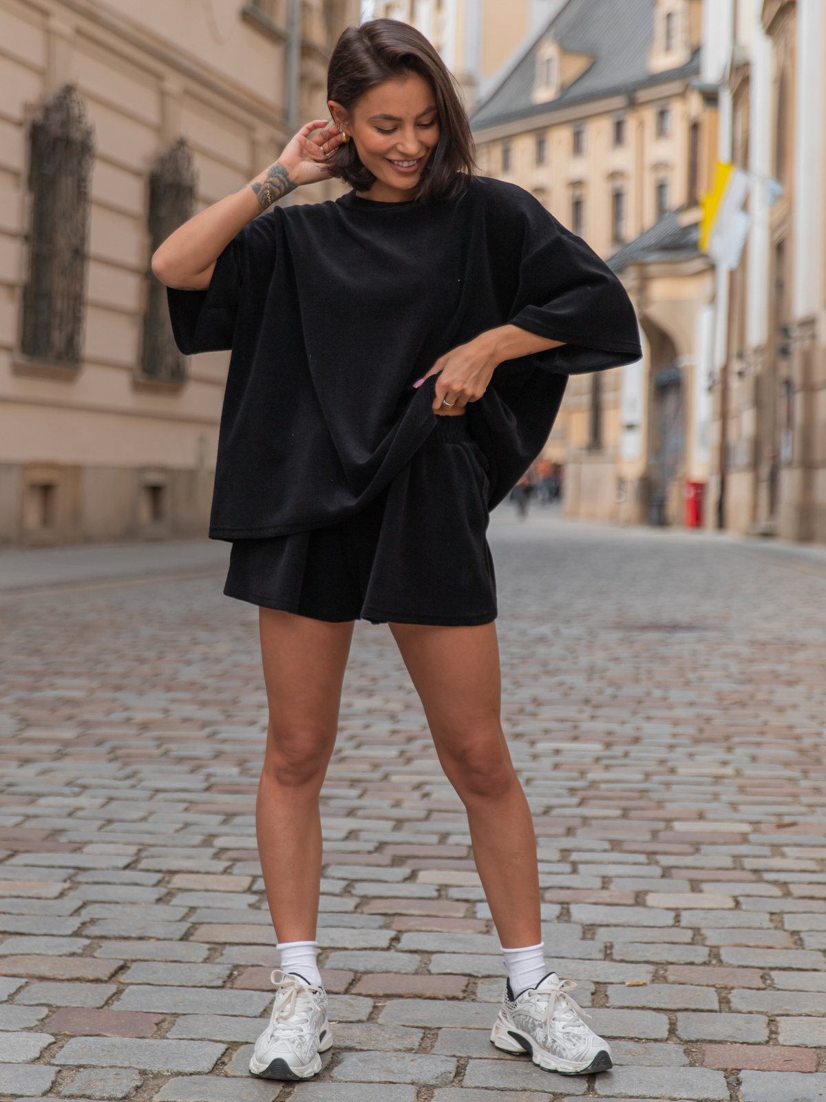 Komplet z dłuższym oversize’owym t-shirtem i szortami uszyty z przyjemnej w dotyku bawełnianej frotty. Materiał o charakterystycznej strukturze nadaje całości świeżego, modowego looku. Idealny na miasto, plażę i leniwe dni. Frotta to hit sezonu — oddychająca, naturalna i nonszalancko stylowa.