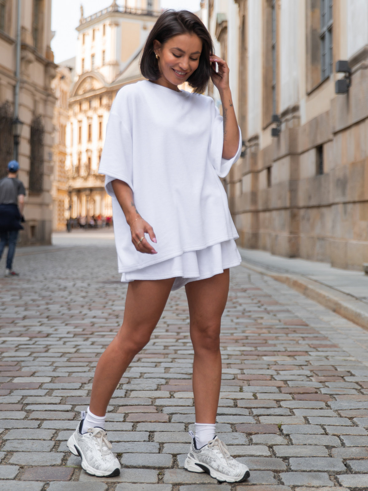 Komplet z dłuższym oversize’owym t-shirtem i szortami uszyty z przyjemnej w dotyku bawełnianej frotty. Materiał o charakterystycznej strukturze nadaje całości świeżego, modowego looku. Idealny na miasto, plażę i leniwe dni. Frotta to hit sezonu — oddychająca, naturalna i nonszalancko stylowa.