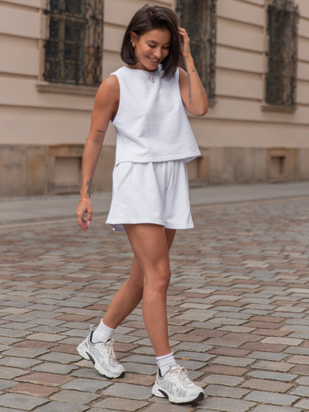 Dresowy bawełniany komplet: bluzka bez rękawów i krótkie spodenki. Uszyty z wysokiej jakości bawełnianej dresówki od polskiego producenta. Komfortowy komplet na co dzień.