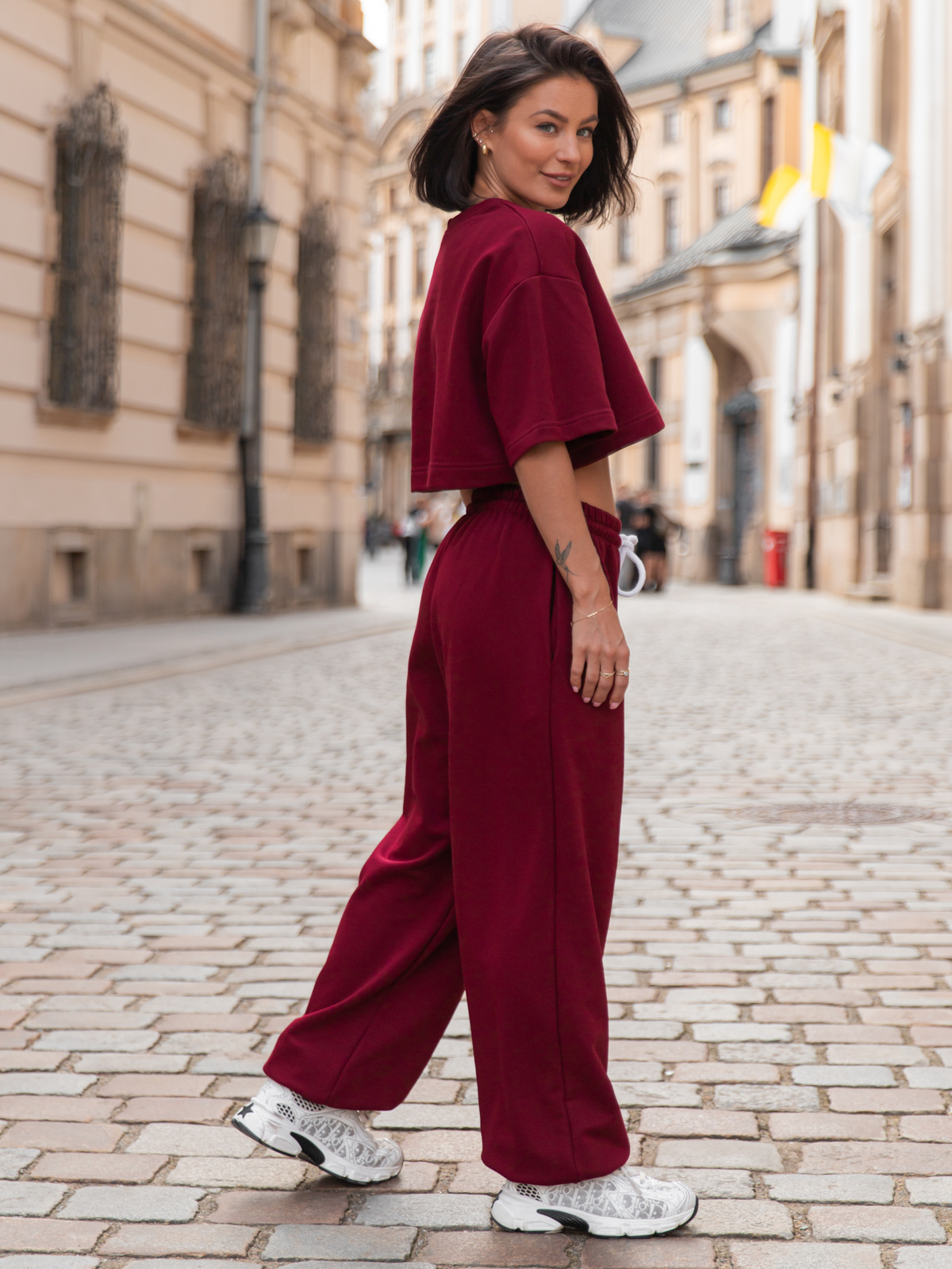Bawełniany dresowy luźny szeroki T-SHIRT z krótkim rękawem bordowy X216 k01