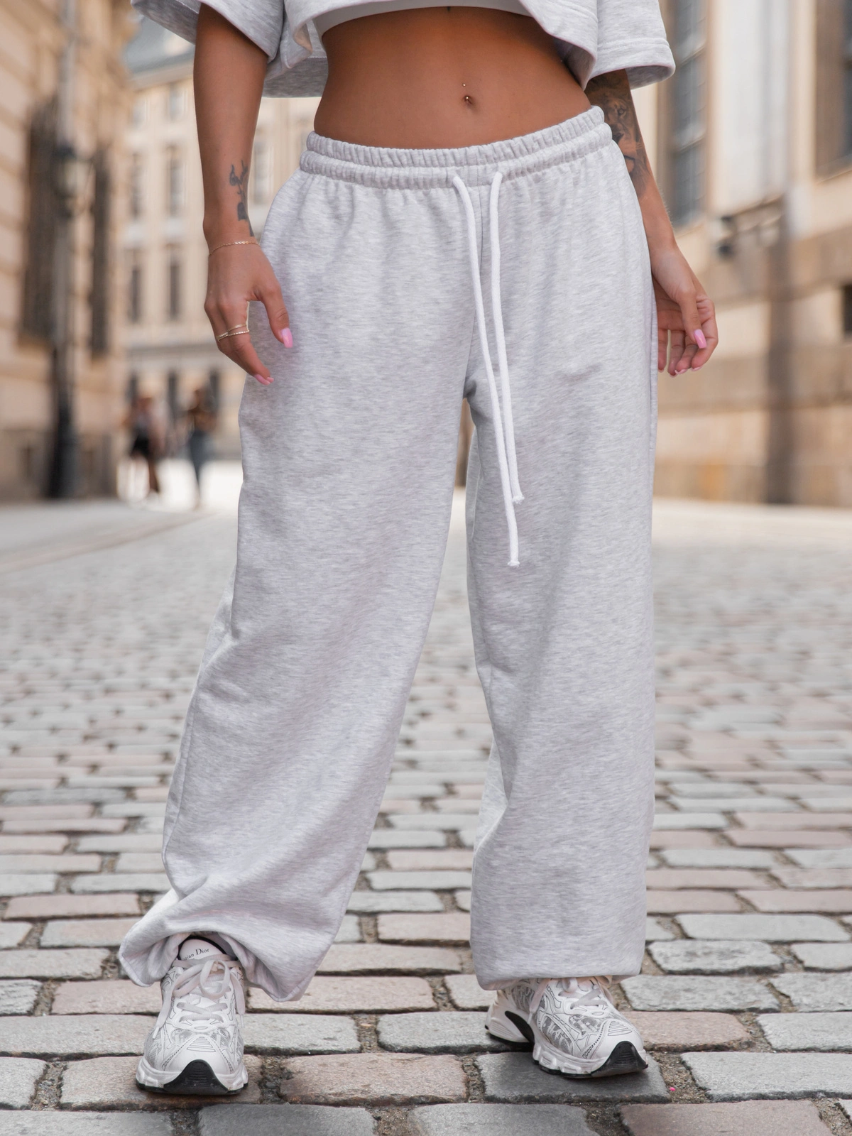 Luźne SPODNIE baggy ze sznurkiem z bawełnianej dresówki niedrapanej od wewnątrz szary melanż X217 k01