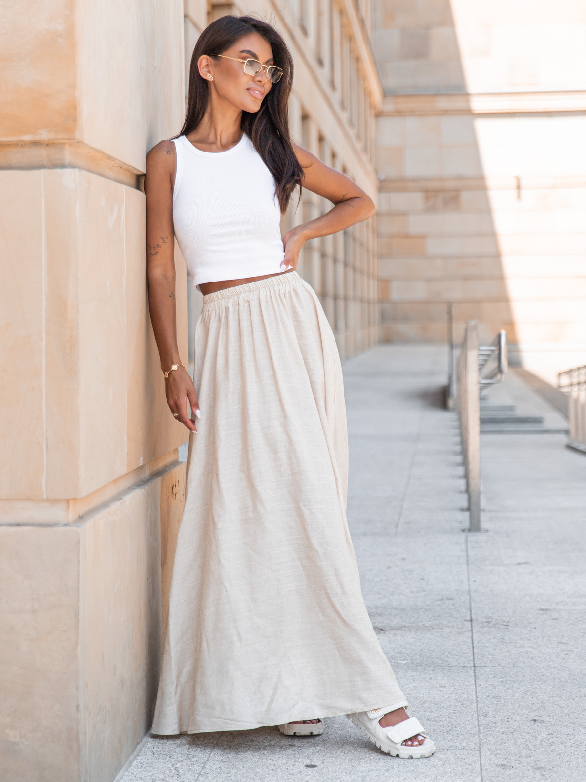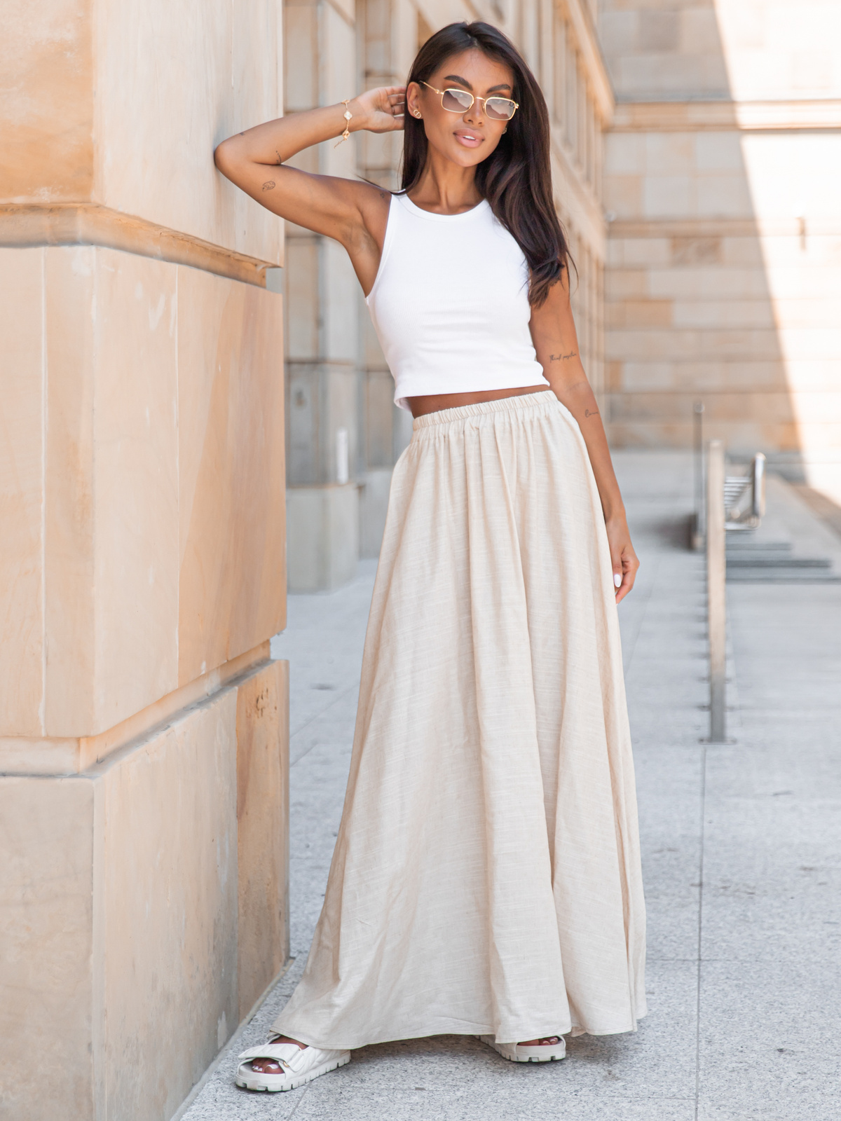 Lniana maxi SPÓDNICA beżowa X252 k01