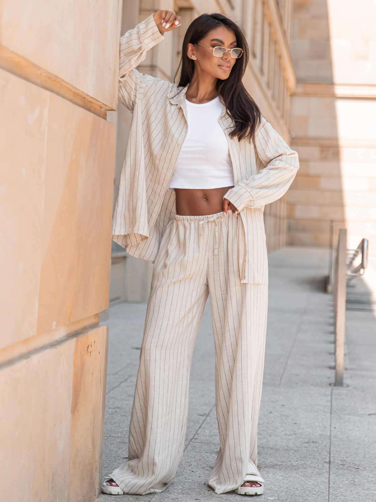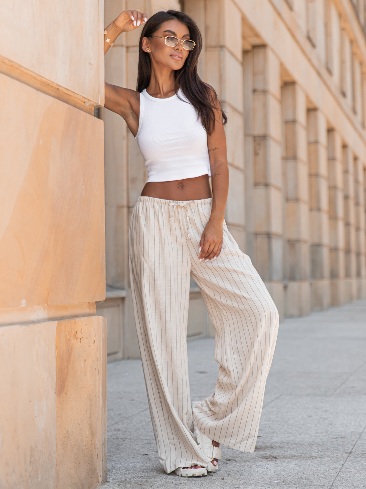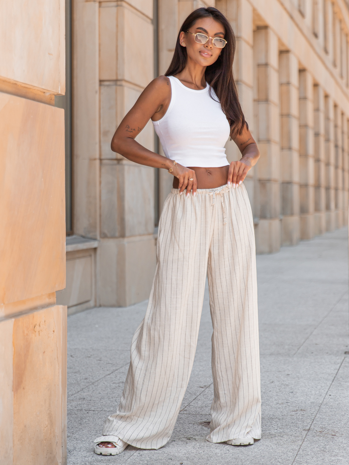 Lniane luźne długie SPODNIE z niższym stanem beżowe w tenisowy prążek X251