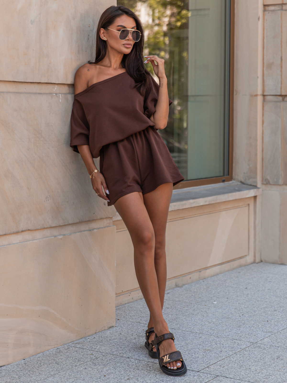 Model posiada krótkie rękawy oraz luźne krótkie spodenki, które gwarantują pełną swobodę ruchów i komfort nawet podczas aktywnego wypoczynku. Górna część kombinezonu została zaprojektowana z dekoltem opuszczanym na ramiona, co dodaje stylizacji lekkości oraz subtelnej zmysłowości. Taki fason podkreśla kobiece ramiona i szyję, nadając całości wakacyjnego, świeżego charakteru.