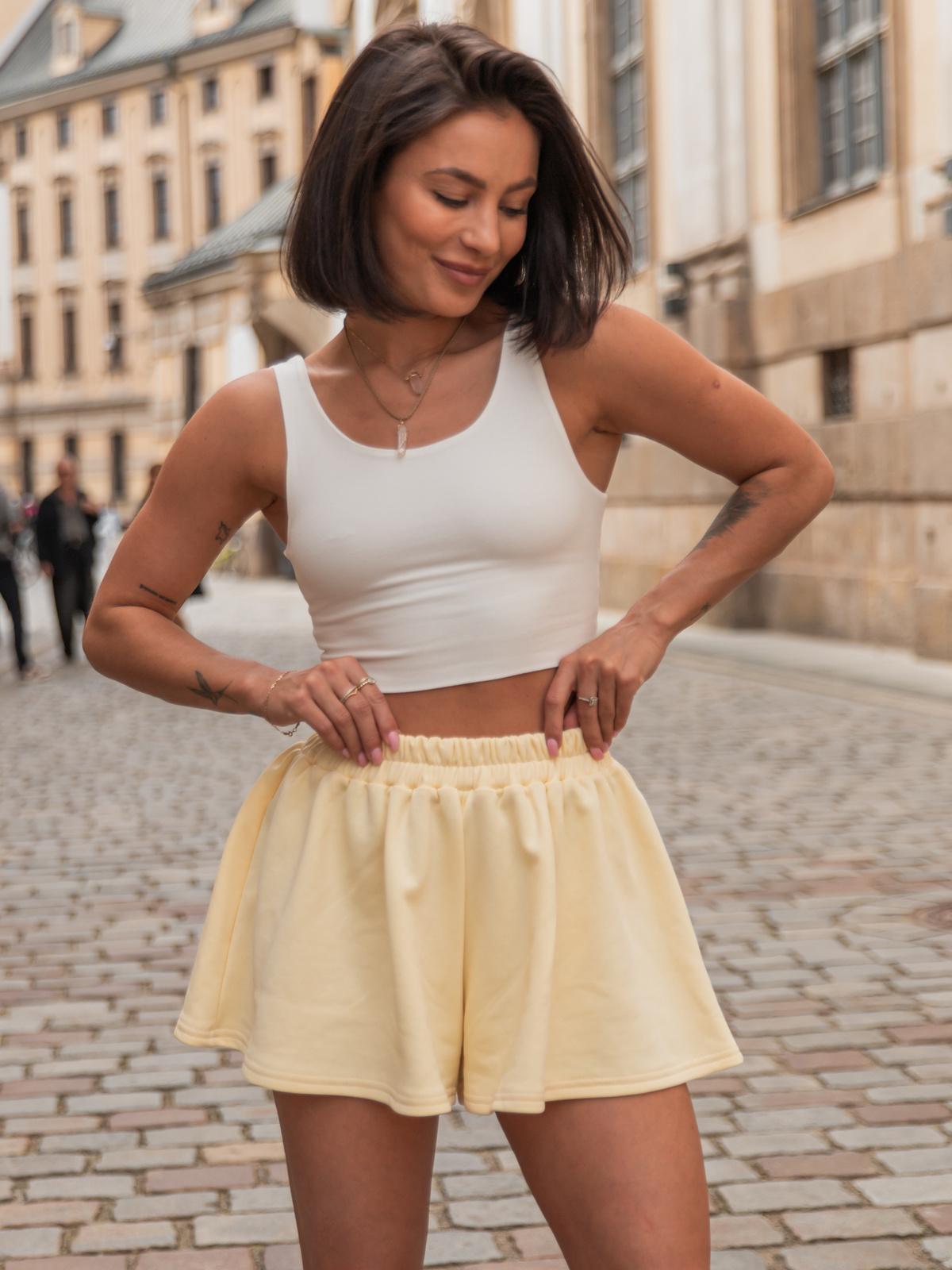 Top: Wykonany z miękkiej, oddychającej wiskozy, która przyjemnie otula ciało. Krótki fason i cienkie ramiączka subtelnie podkreślają sylwetkę, jednocześnie zapewniając wygodę i swobodę ruchu. Idealny do noszenia solo lub pod oversize’ową bluzę czy marynarkę. Elastyczny materiał dopasowuje się do ciała i pięknie je modeluje.