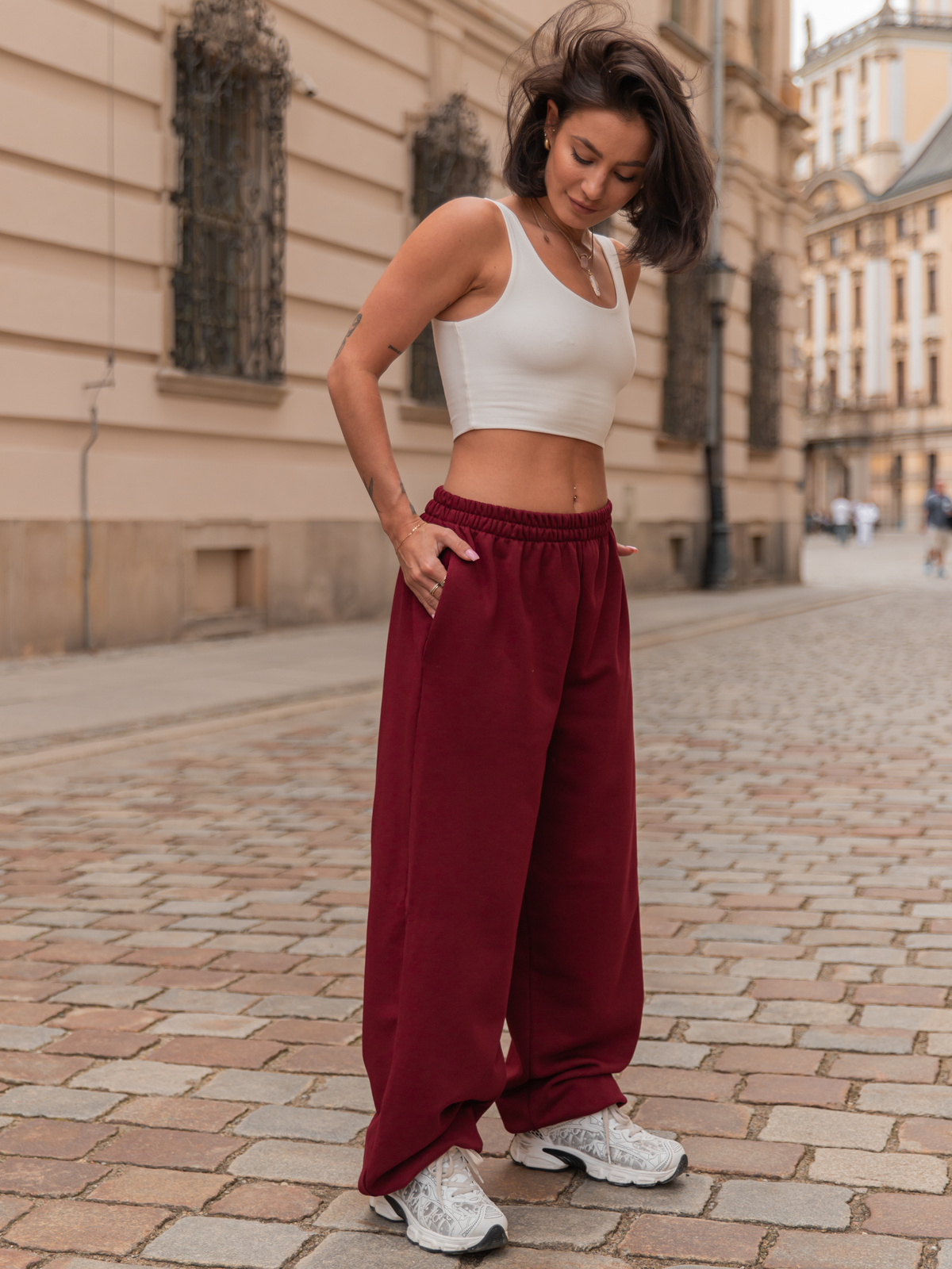 Spodnie baggy: Uszyte z wysokiej jakości dzianiny dresowej typu „pętelka” (niedrapanej od wewnątrz), są luźne, przewiewne i wygodne. Posiadają gumkę w pasie, praktyczne kieszenie i ściągacze przy nogawkach, co nadaje im swobodny, streetwearowy charakter. Idealne zarówno na relaks w domu, jak i aktywne dni na mieście.