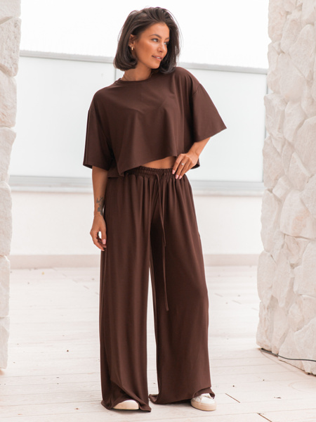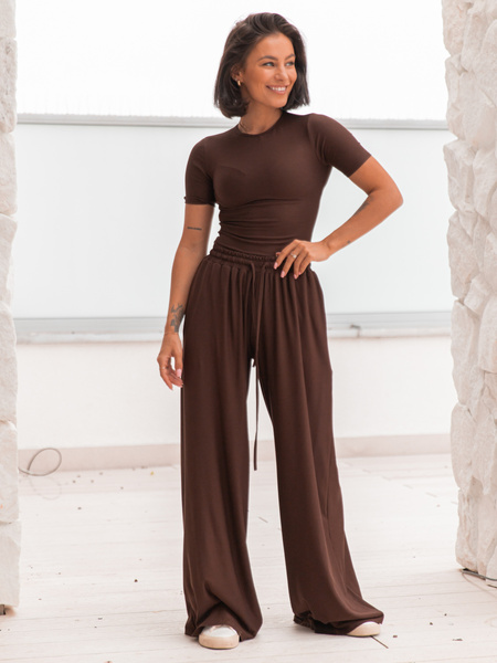 Szerokie SPODNIE z wiskozy ze średnim stanem z gumką w pasie czekoladowe X202 k01 (1 szt.)