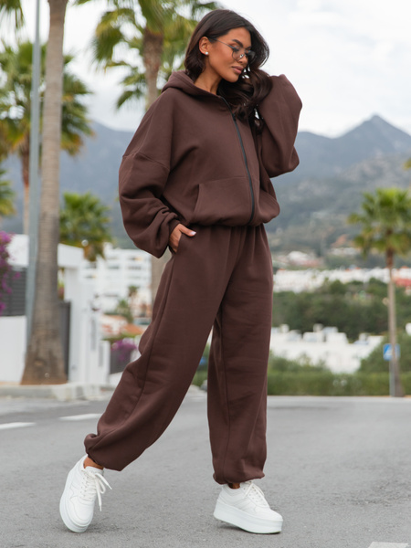 Szeroka, luźna bluza z kapturem zapinana na zamek oraz spodnie typu baggy tworzą wyjątkowo wygodny i stylowy zestaw, idealny zarówno na co dzień, jak i na luźniejsze wyjścia.