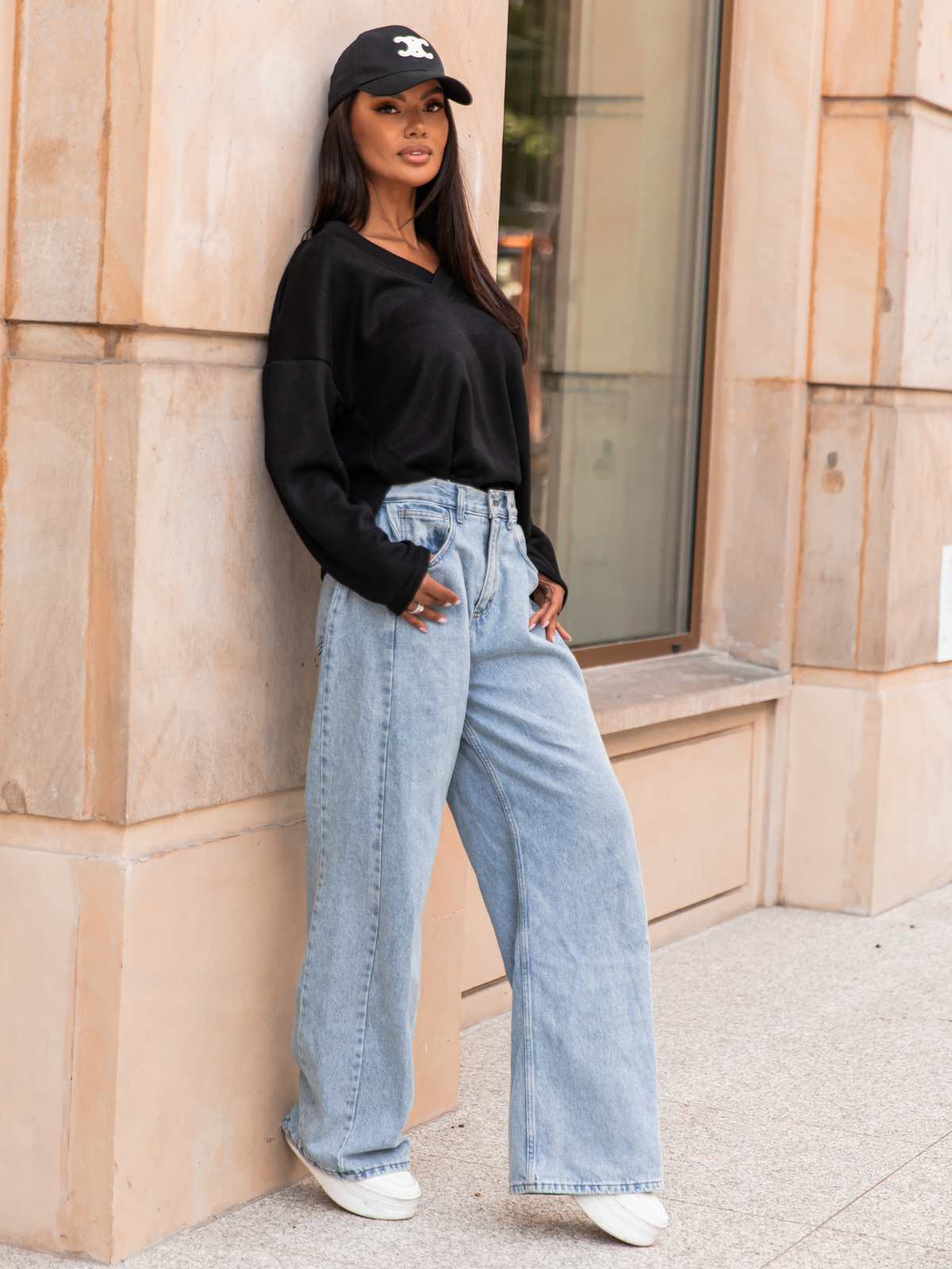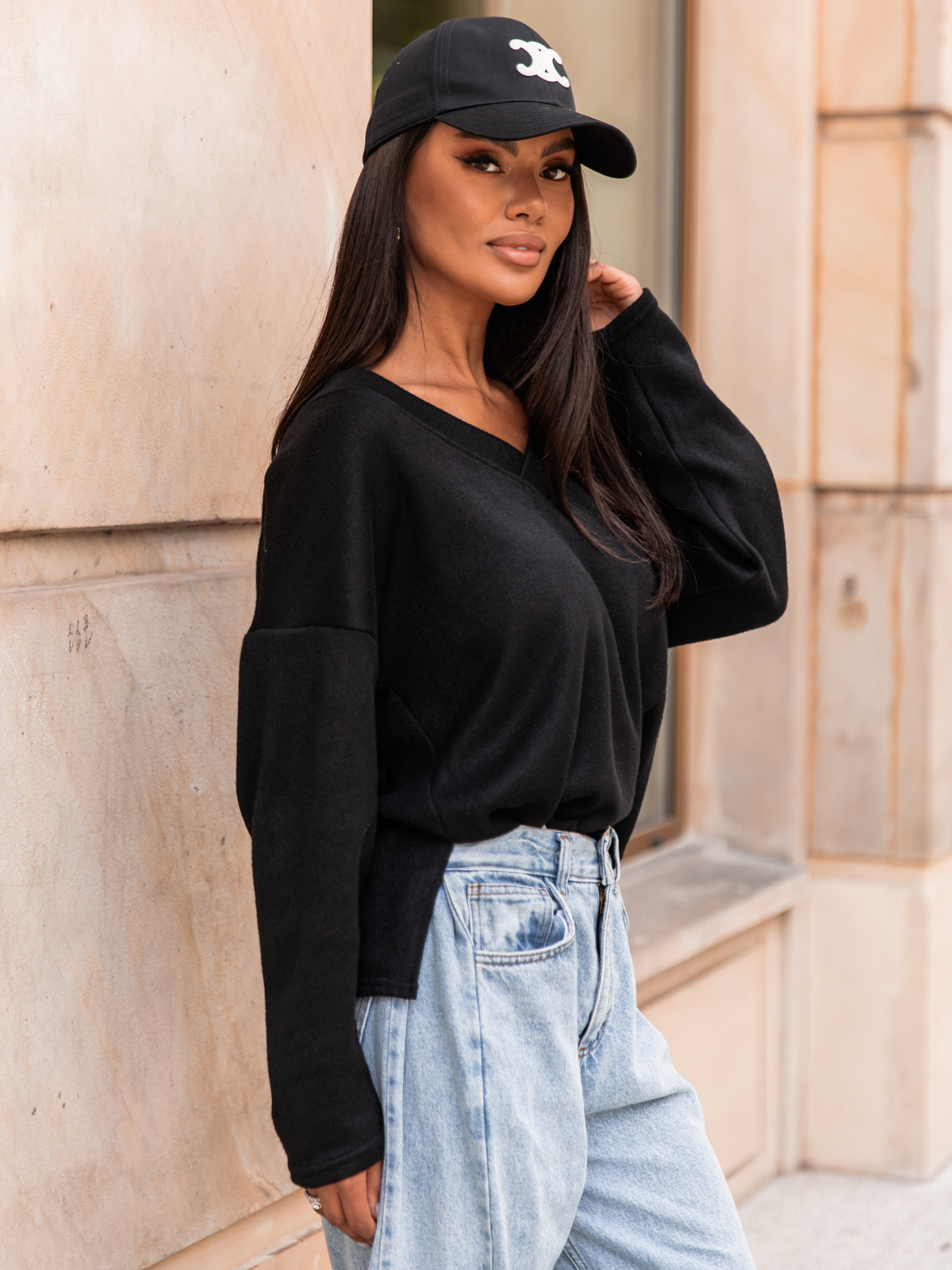 Ten sweter o luźnym kroju z dekoltem w serek to połączenie wygody, klasy i odrobiny nonszalancji – idealny miks na każdą okazję.