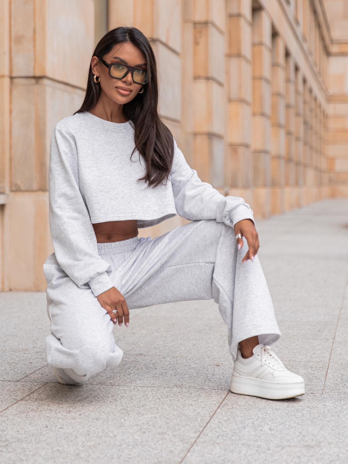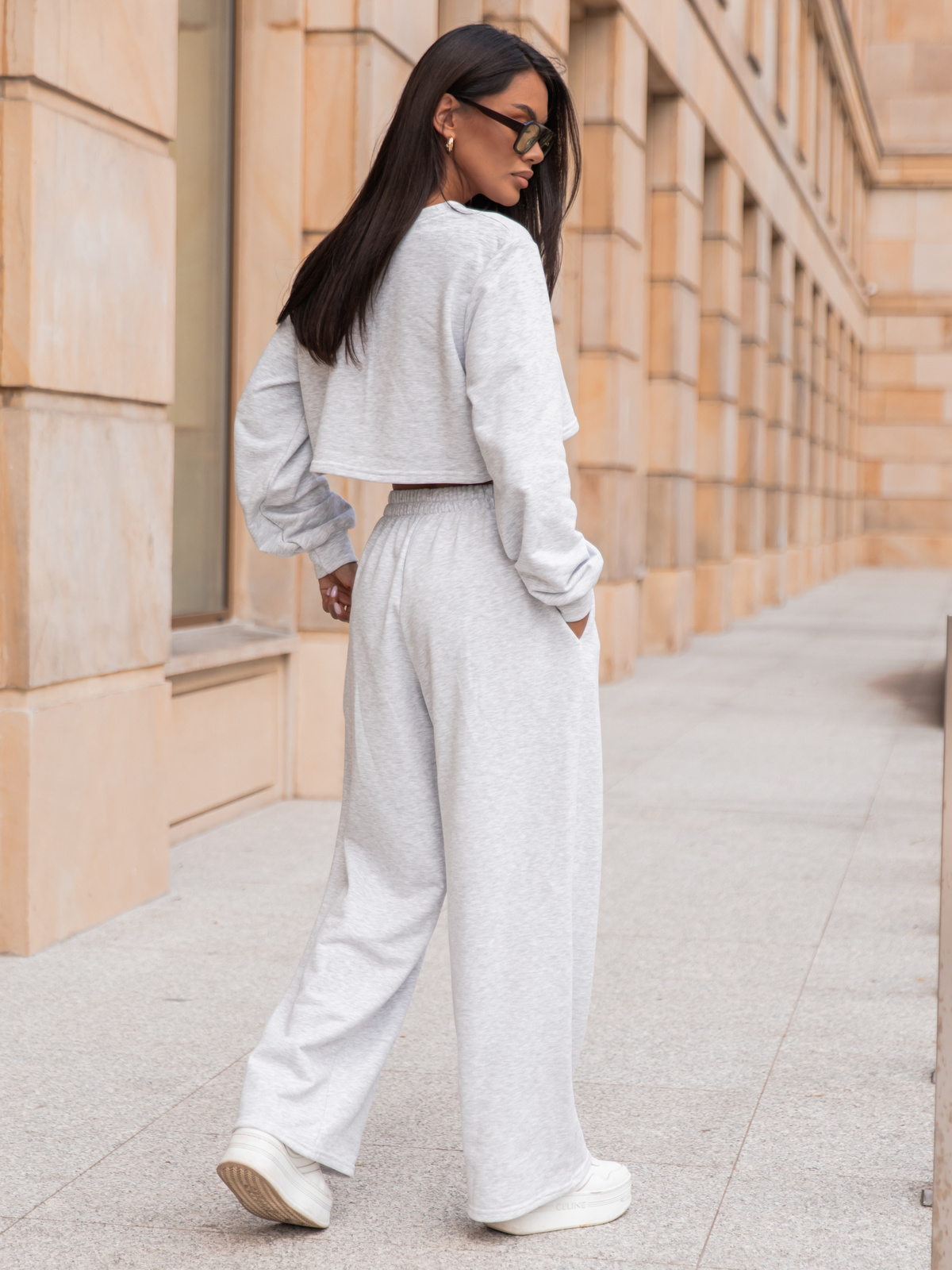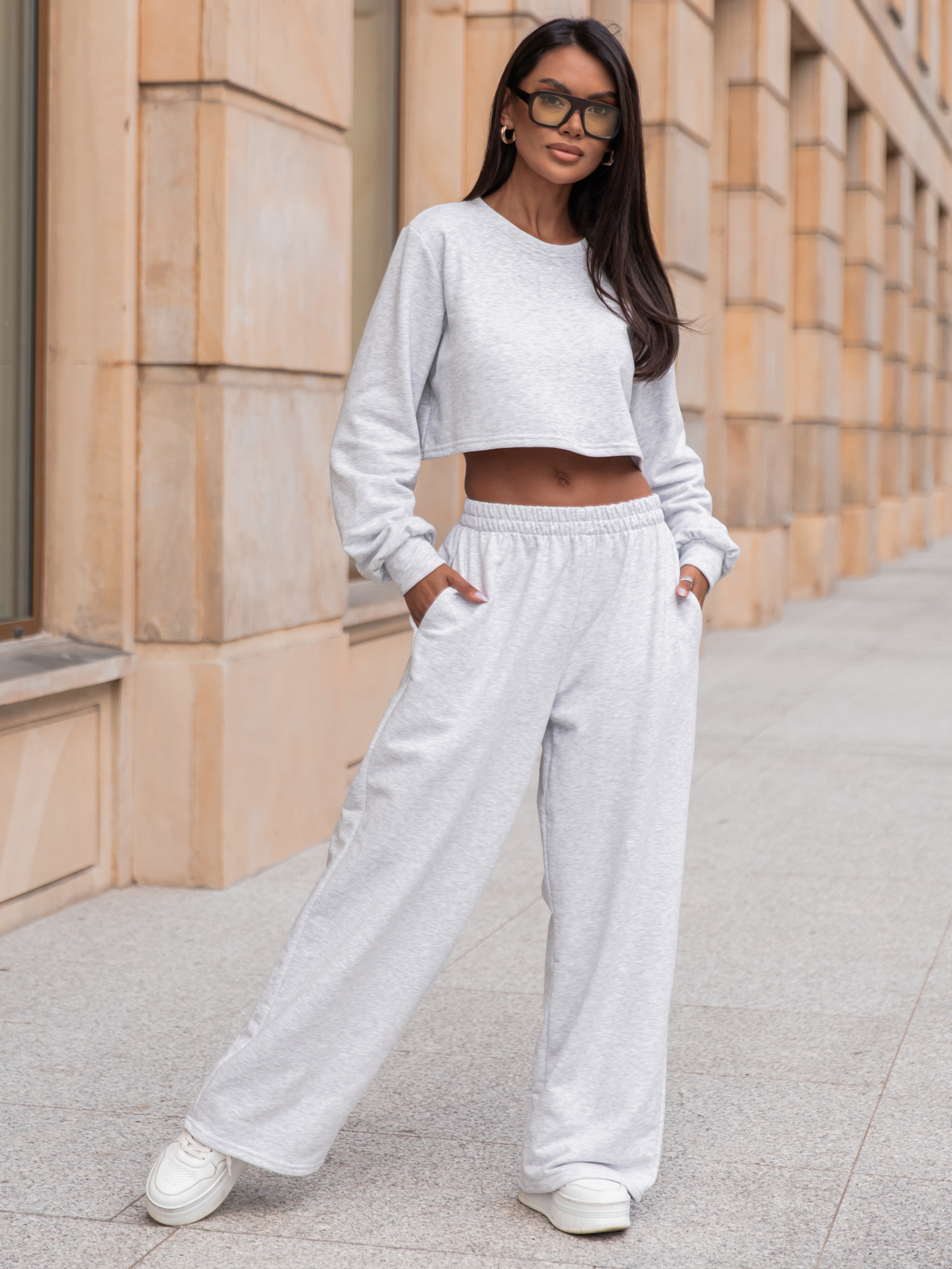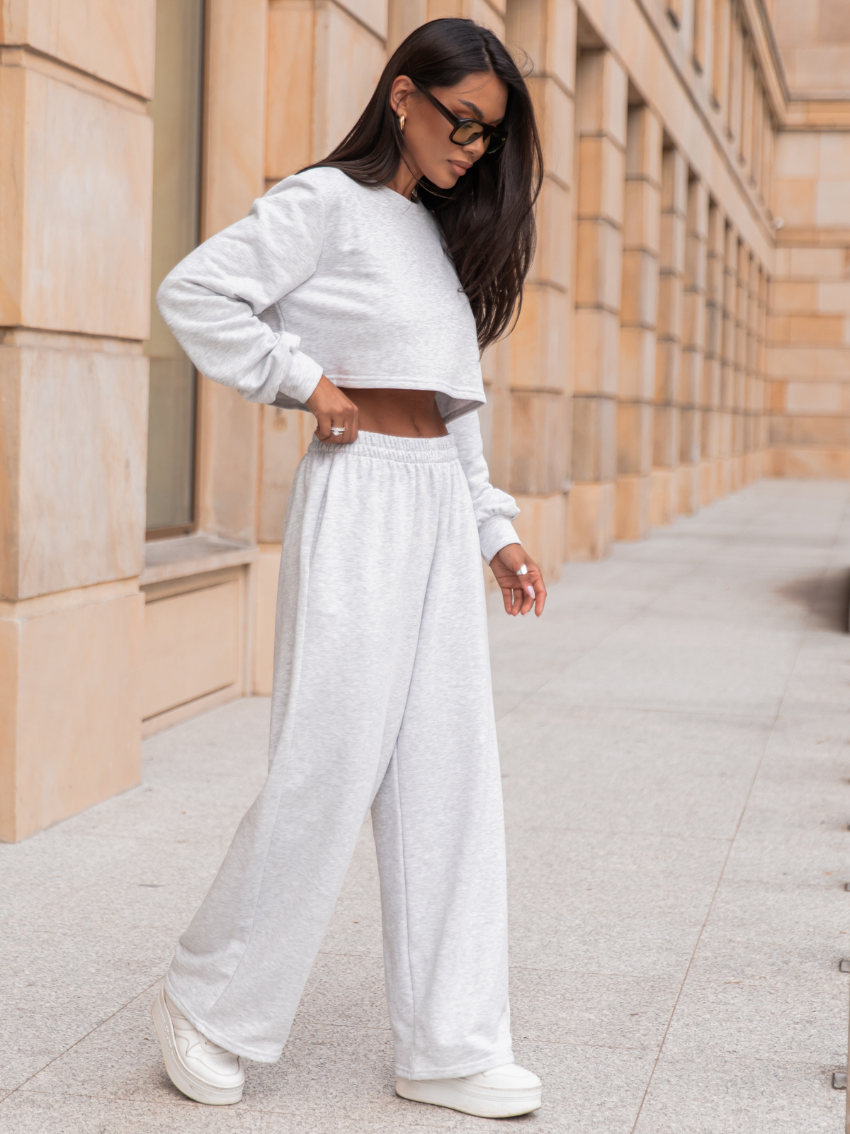 Dresowy komplet : oversize t-shirt damski – krótki, luźny, z długim rękawem i luźne spodnie z szerokimi nogawkami z wysokim stanem.