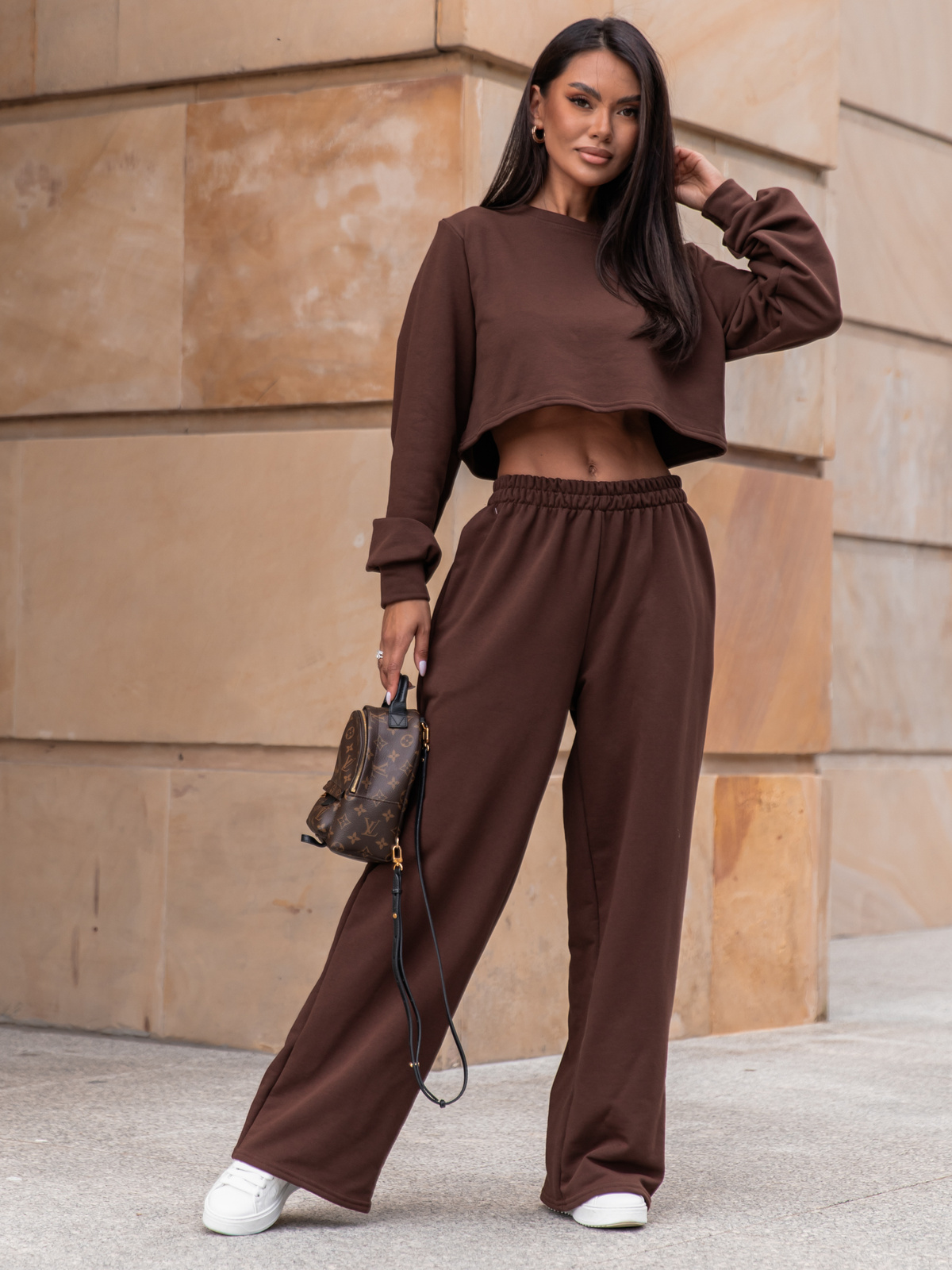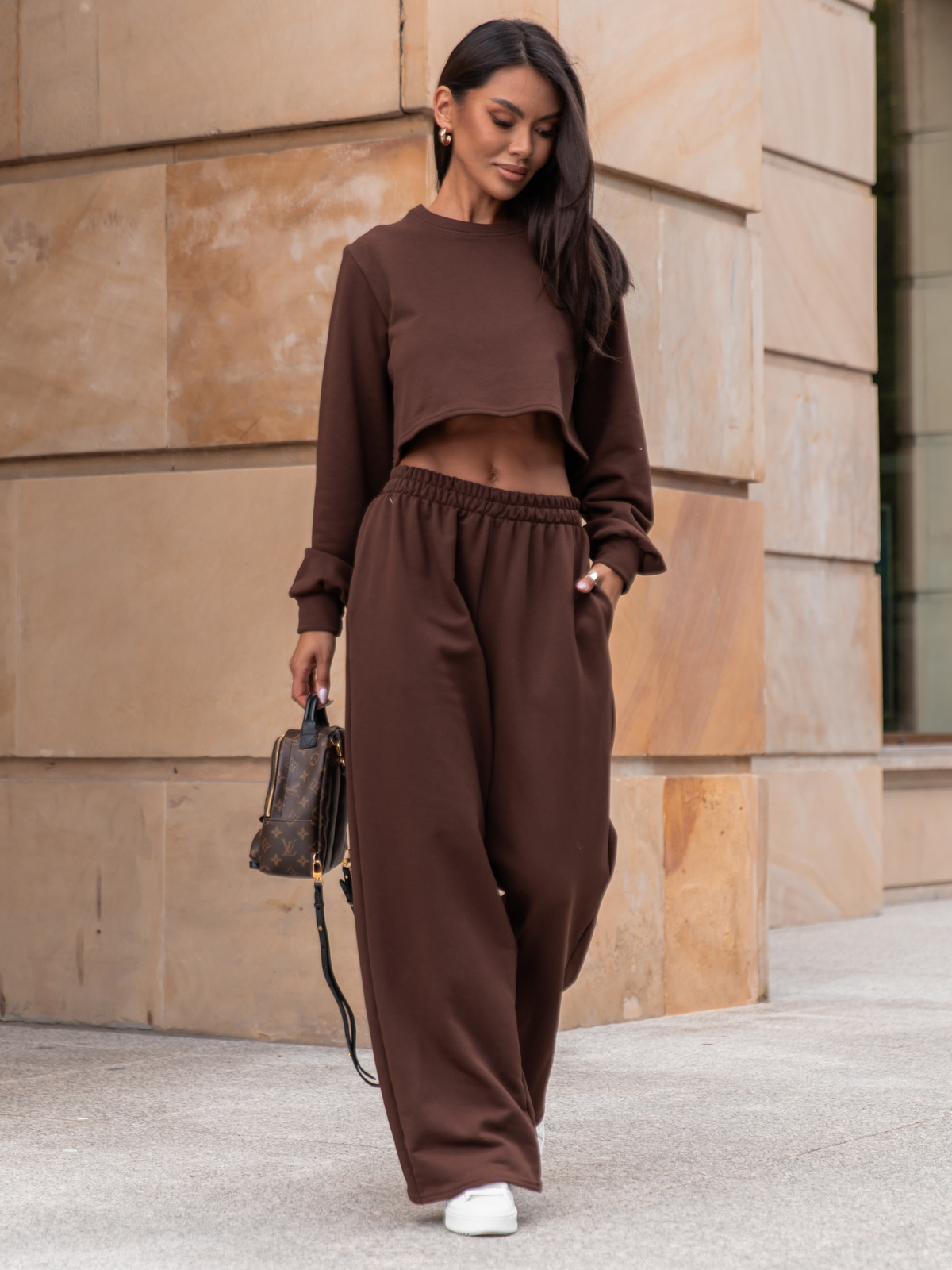 Dresowy komplet : oversize t-shirt damski – krótki, luźny, z długim rękawem i luźne spodnie z szerokimi nogawkami z wysokim stanem.