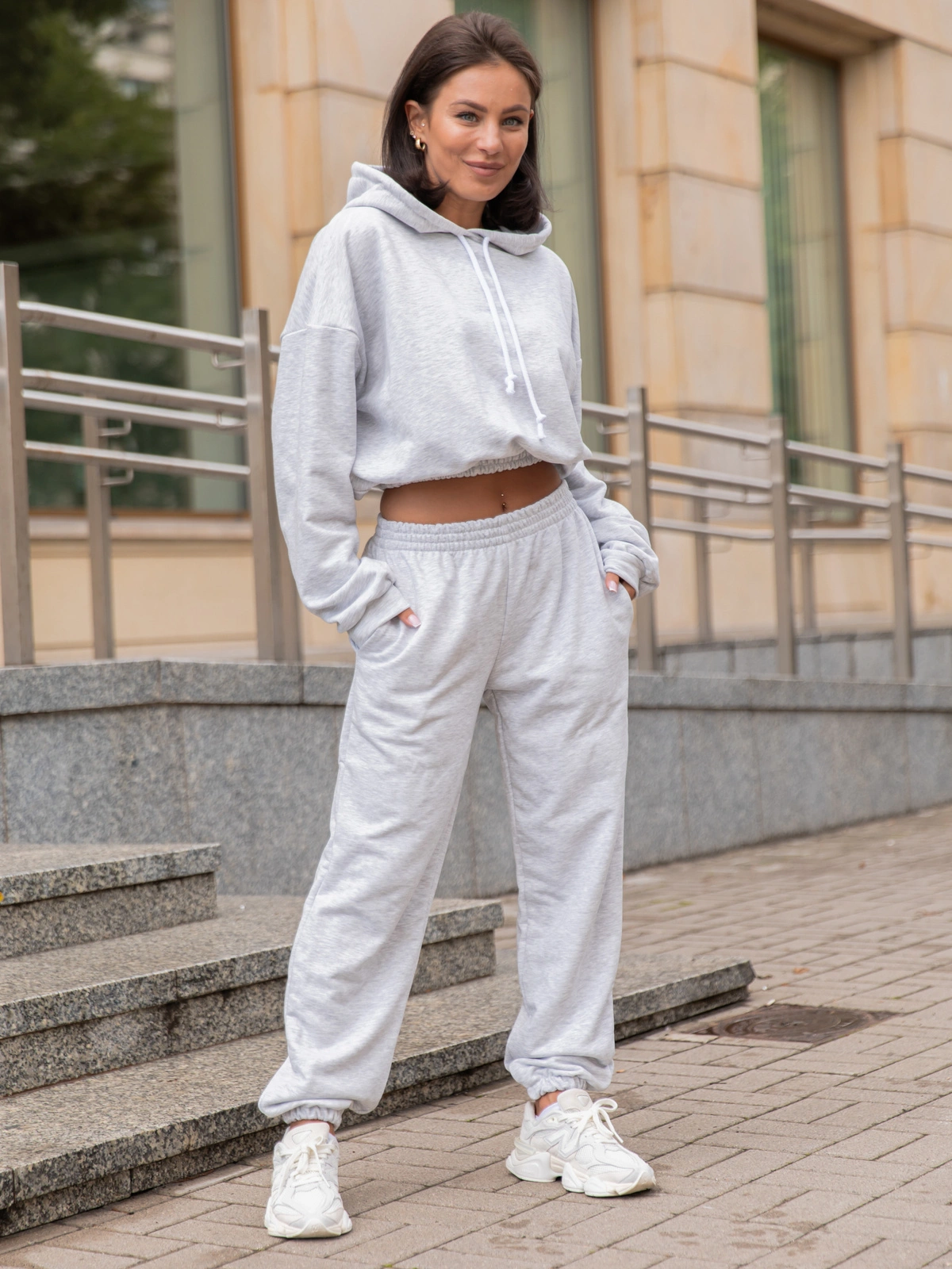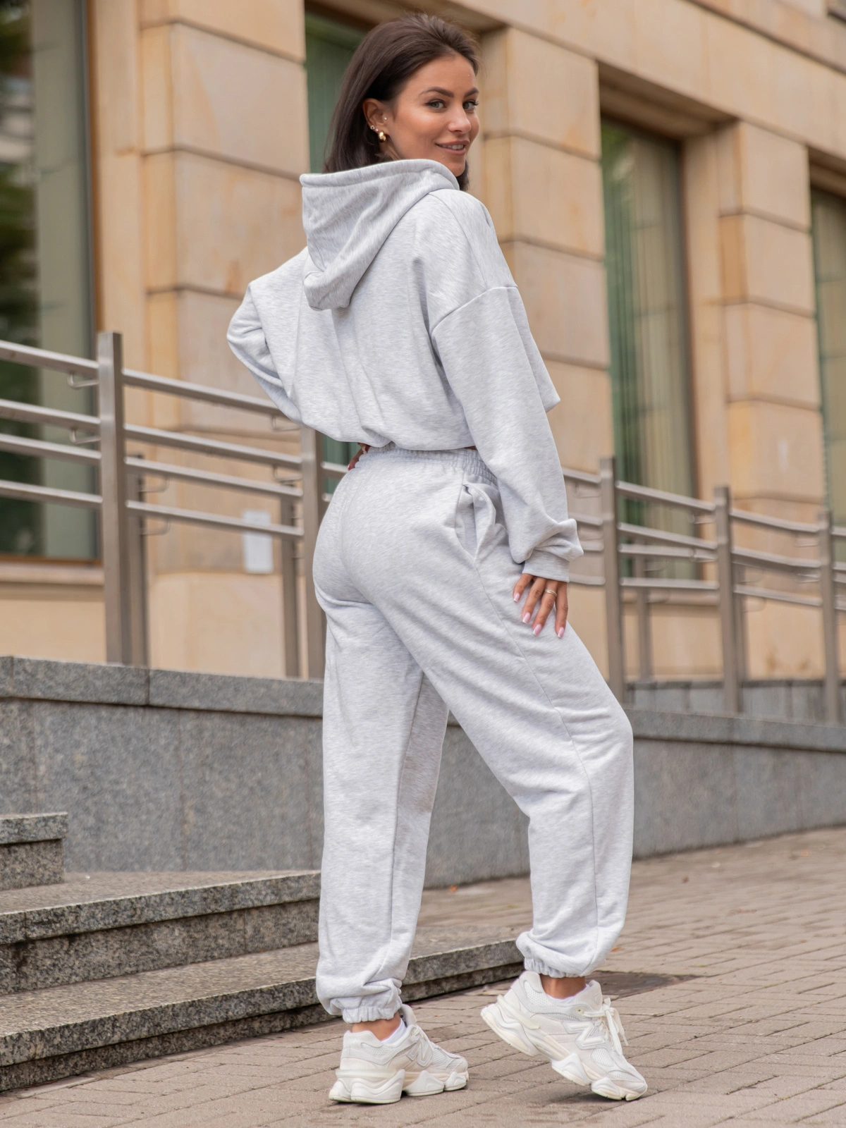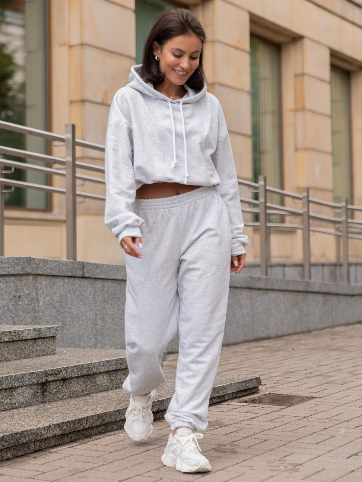 Dresowy bawełniany KOMPLET bluza kangurka z kapturem i spodnie klasyczny krój szary melanż X305 k01
