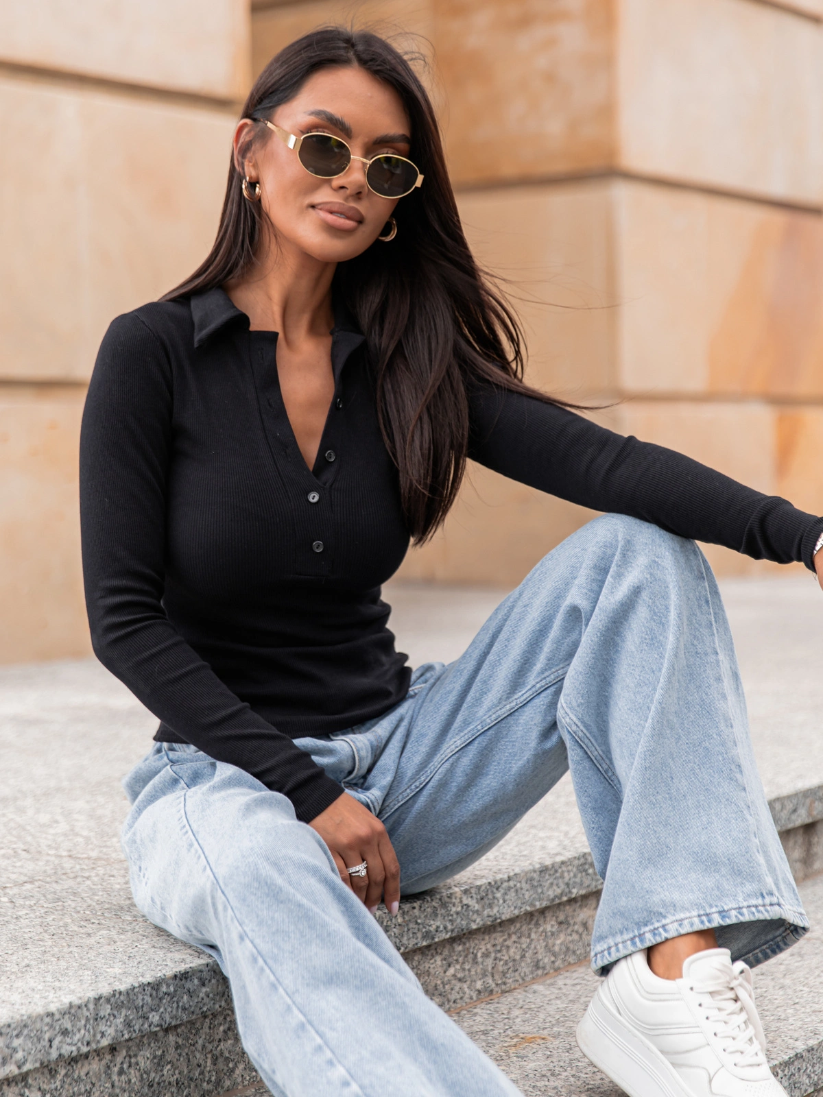 Dopasowana bluzka z długim rękawem. Z przodu znajduje się zapięcie na guziki, które pozwala regulować głębokość dekoltu – możesz nosić go bardziej klasycznie lub odważniej, w zależności od okazji. Klasyczny kołnierzyk dodaje całości elegancji i modowego sznytu, tworząc wyjątkowe połączenie wygody z nutą szyku.