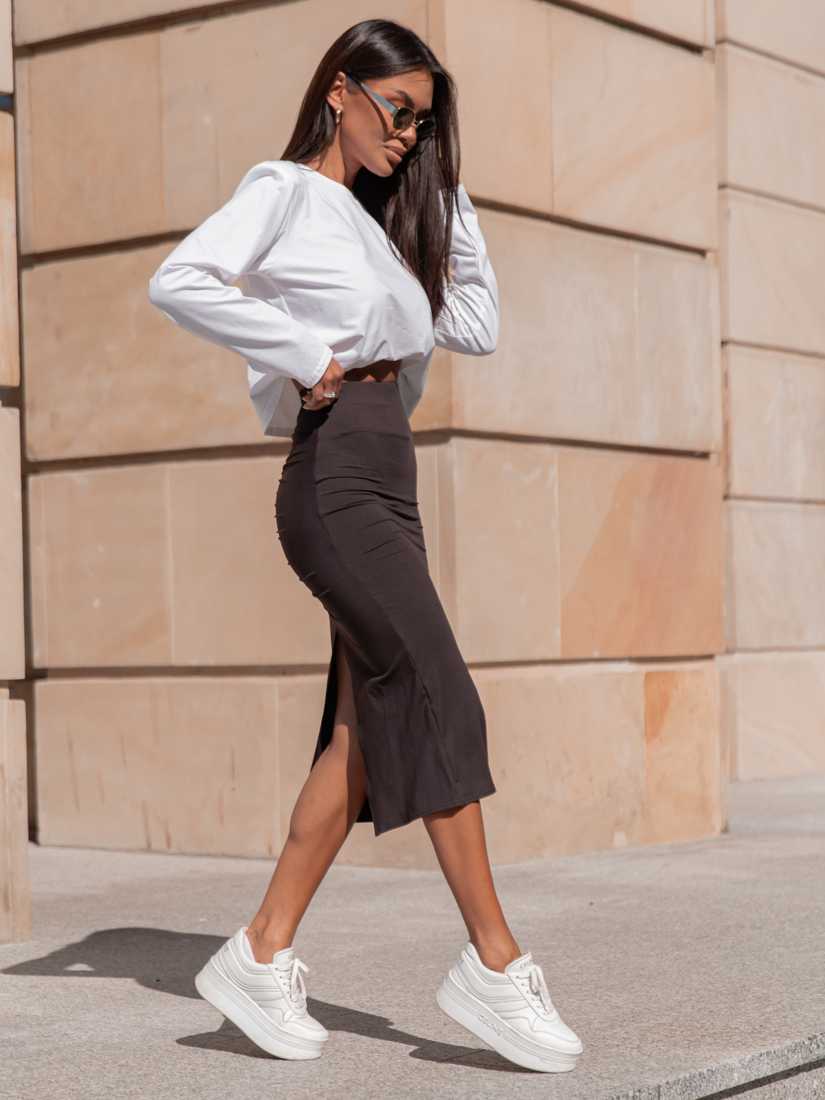 ZESTAW: bawełniany T-SHIRT z długim rękawem i poduszkami na ramionach X308 + obcisła midi SPÓDNICA push-up X310
