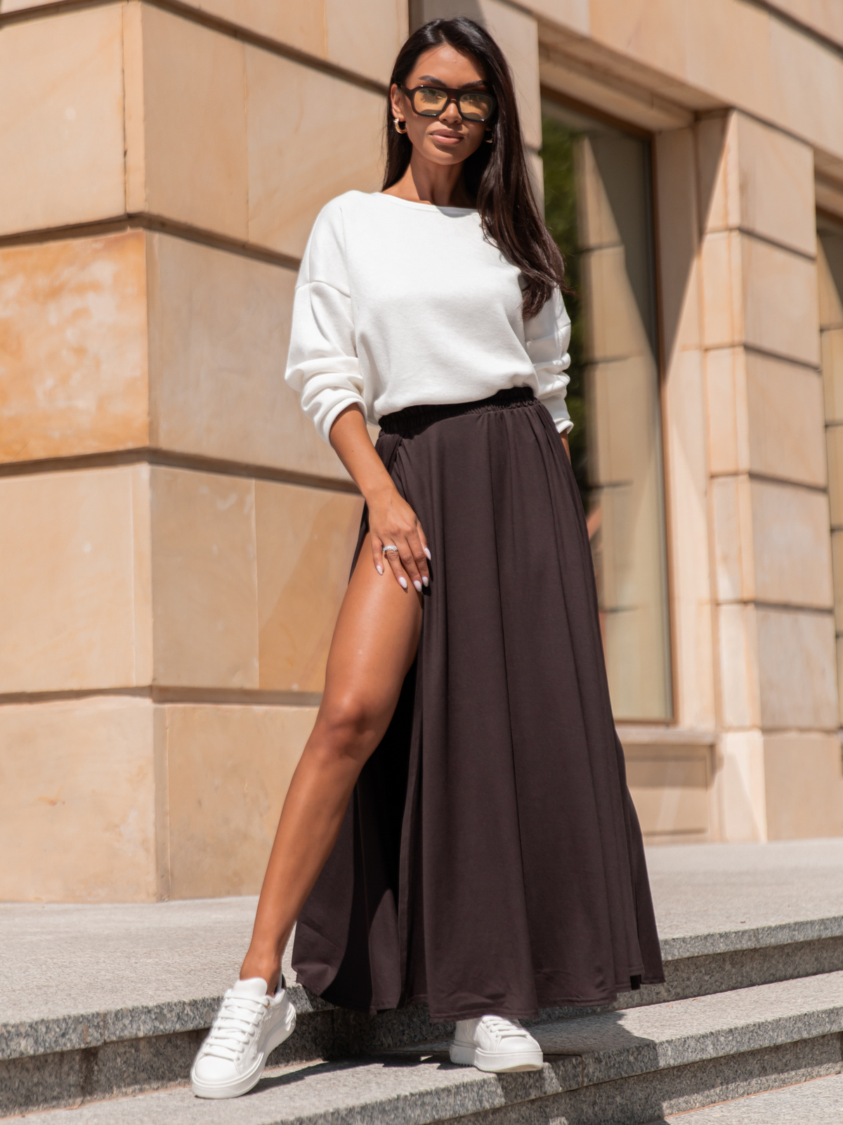 Rozkloszowana maxi SPÓDNICA z rozporkami po bokach czekoladowa X311