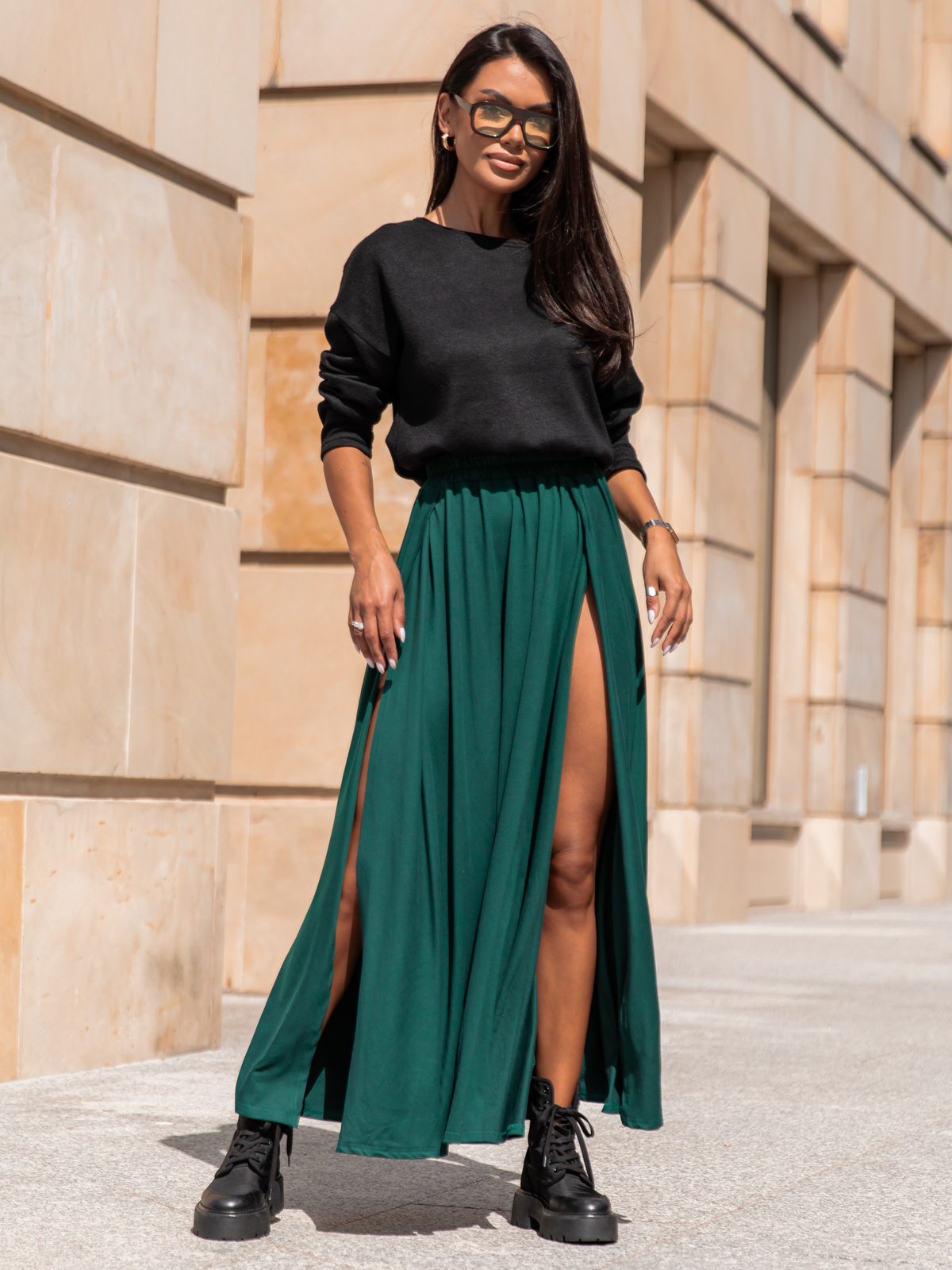 Rozkloszowana maxi SPÓDNICA z rozporkami po bokach zielona X311