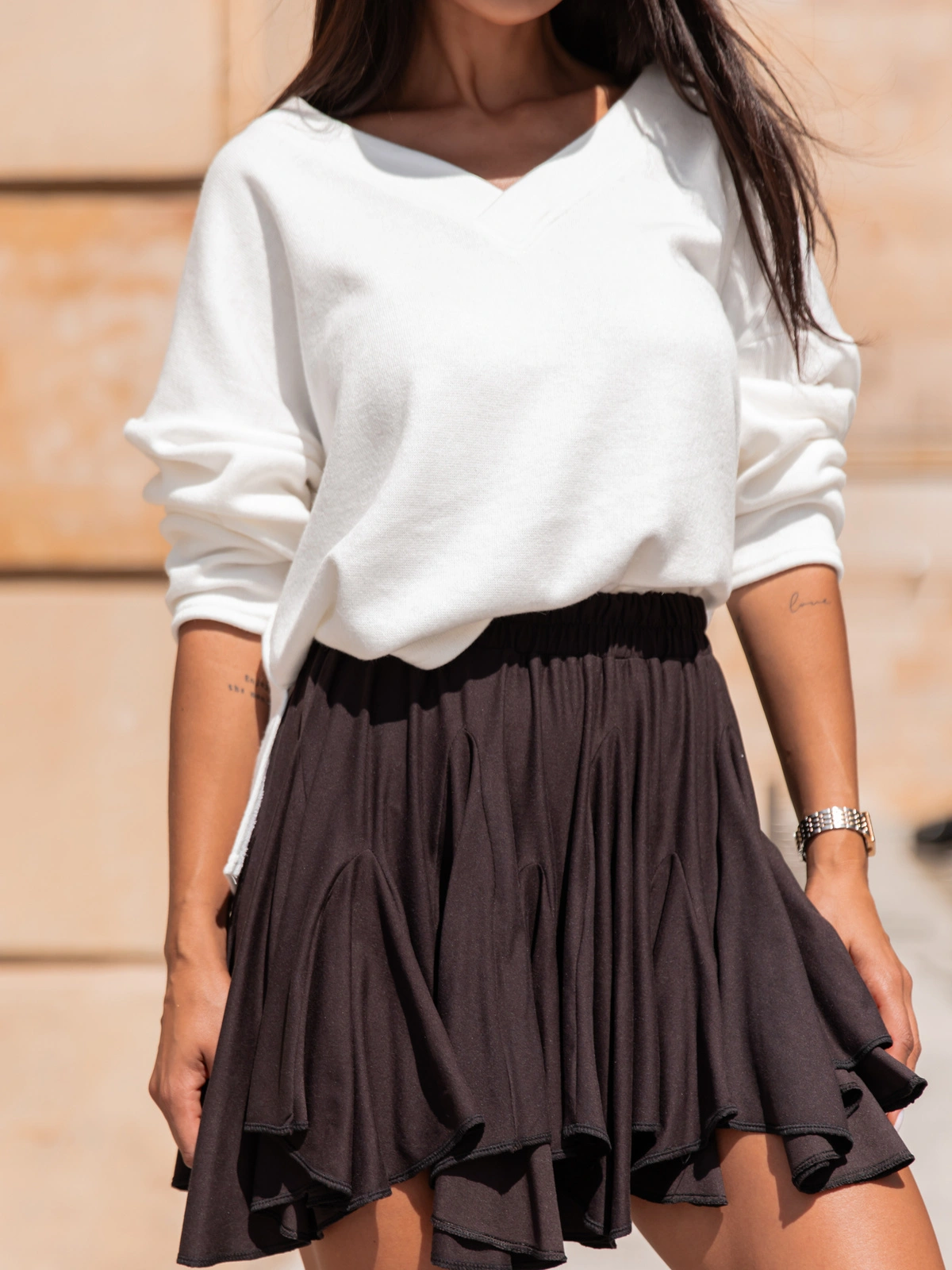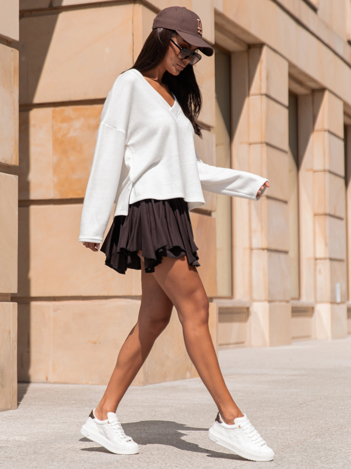 Ten sweter o luźnym kroju z dekoltem w serek to połączenie wygody, klasy i odrobiny nonszalancji – idealny miks na każdą okazję.
