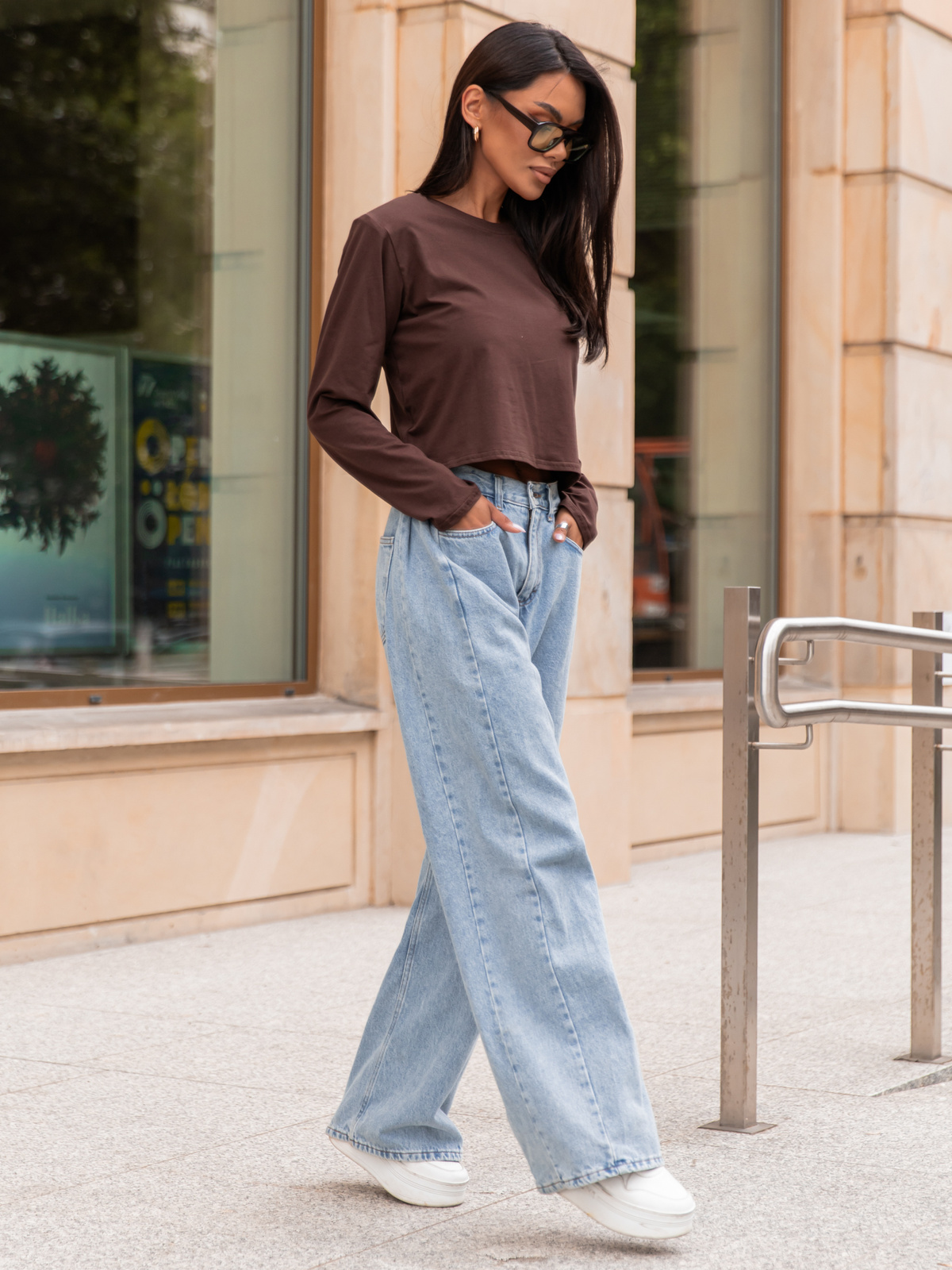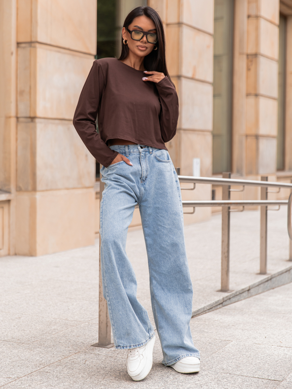 Bawełniany T-SHIRT bluzka z długim rękawem z poduszkami na ramionach brązowa X308