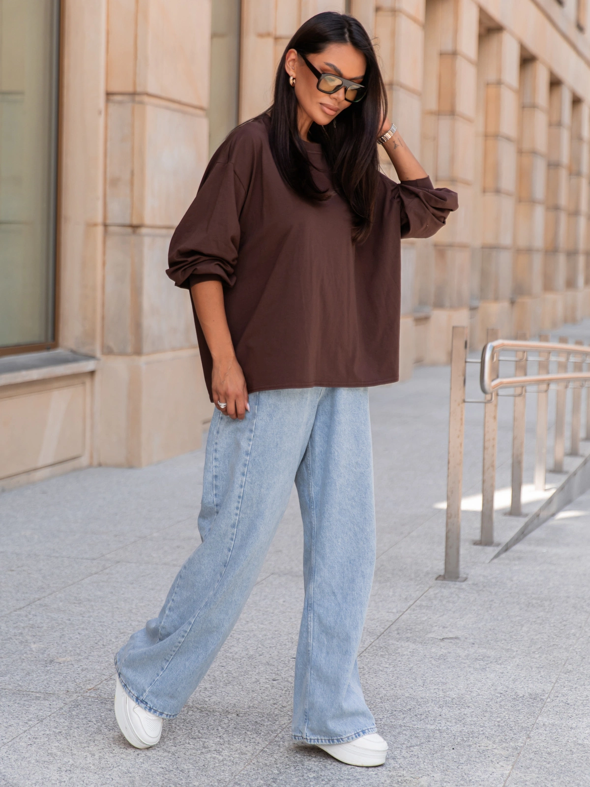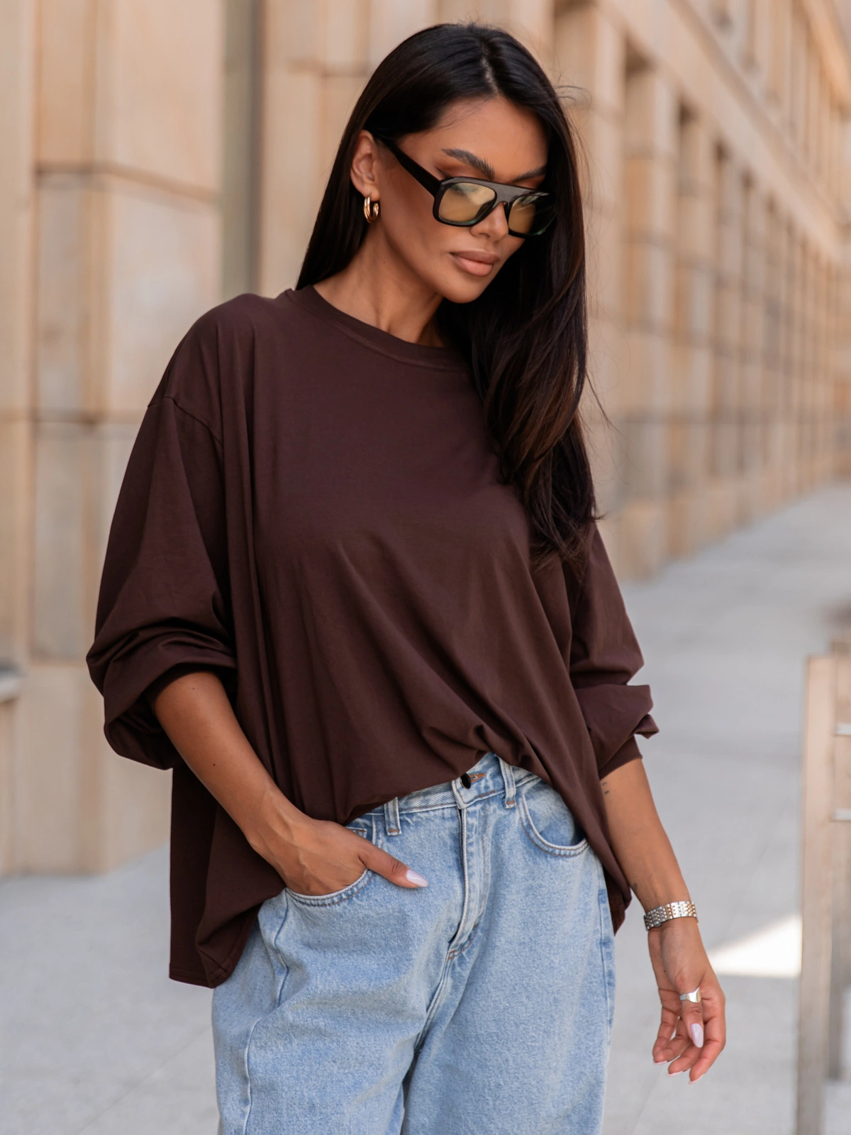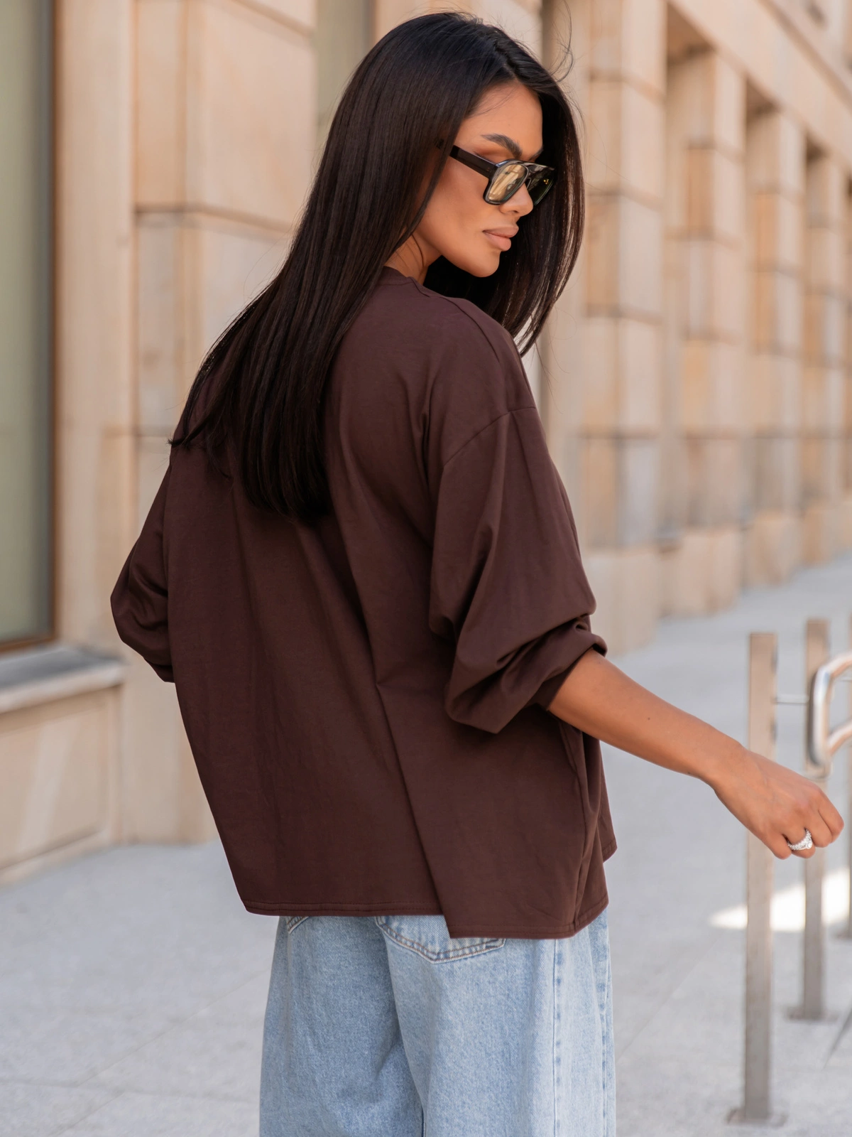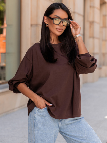Oversizowy T-SHIRT bluzka z długim rękawem z bawełny brązowy X313