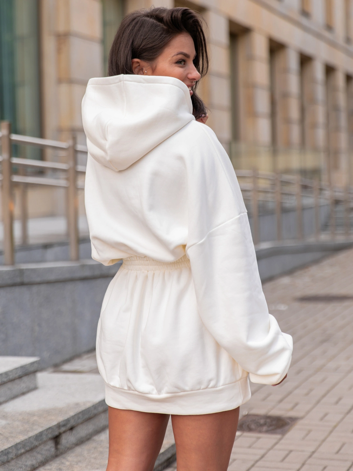 Dresowa bawełniana oversizowa SUKIENKA BLUZA kangurka z kapturem z gumką w pasie ecru X314 k01