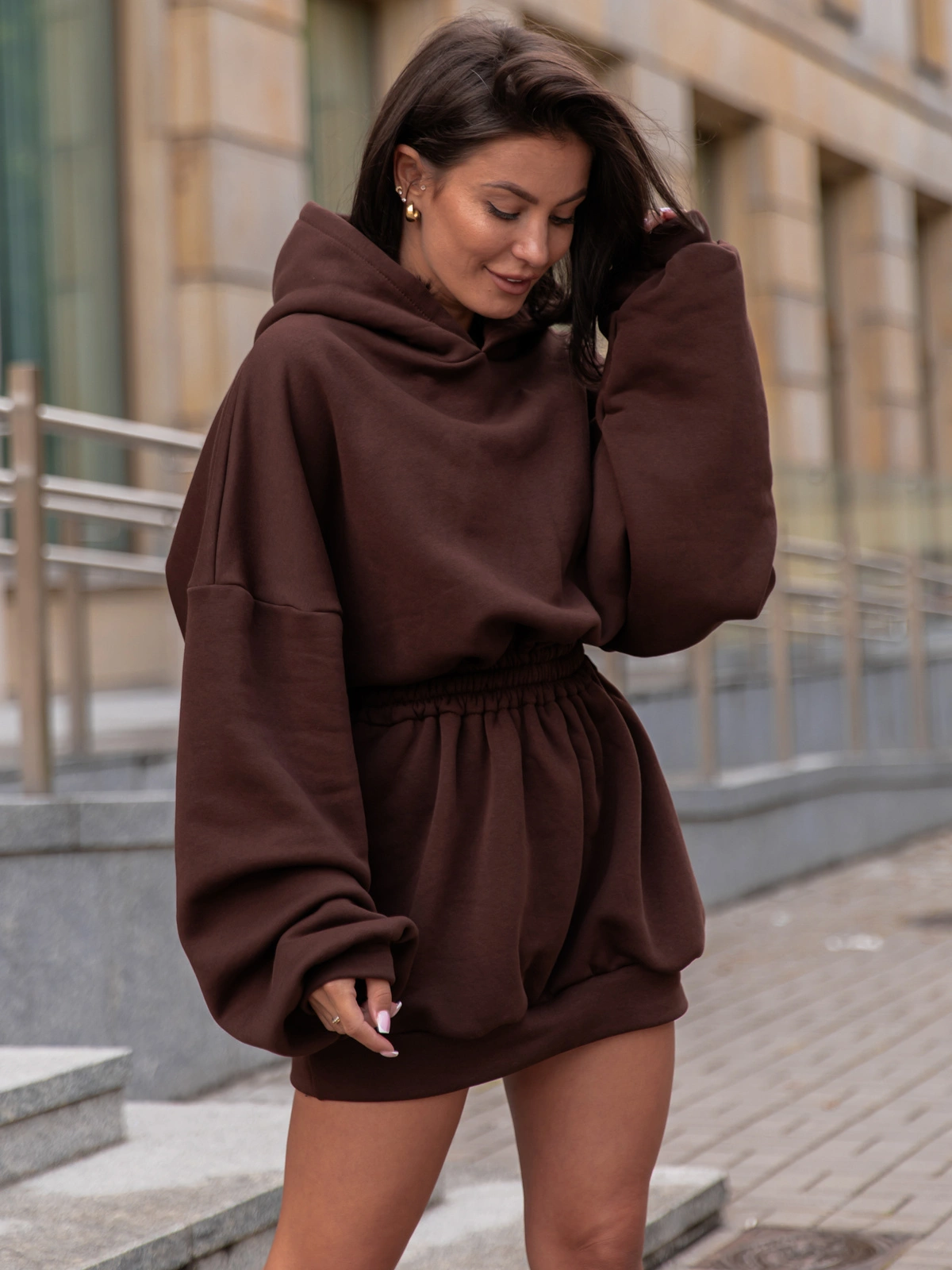Dresowa bawełniana oversizowa SUKIENKA BLUZA kangurka z kapturem z gumką w pasie brązowa X314 k01