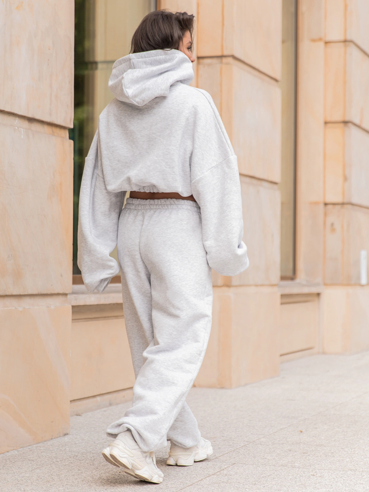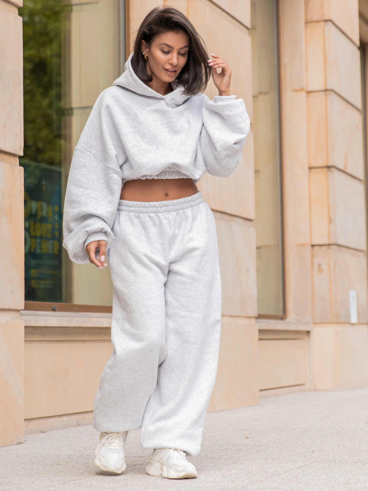Dresowa bawełniana BLUZA kangurka z kapturem o krótszym kroju bluzowana szary melanż X304